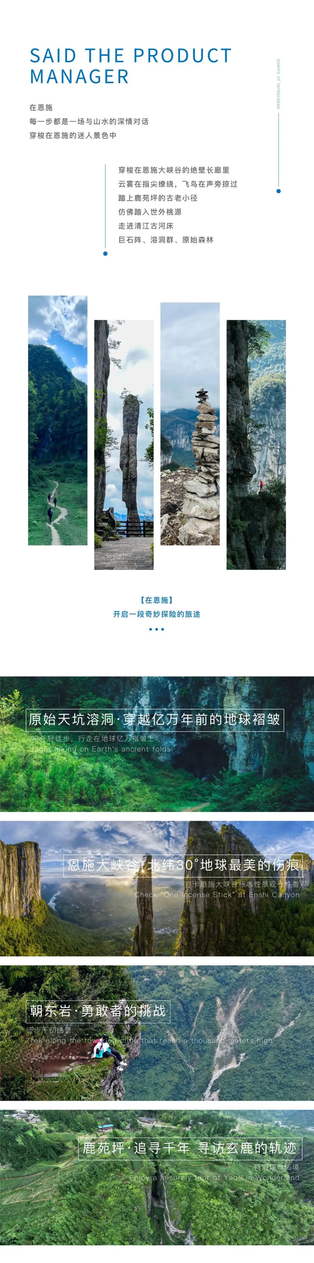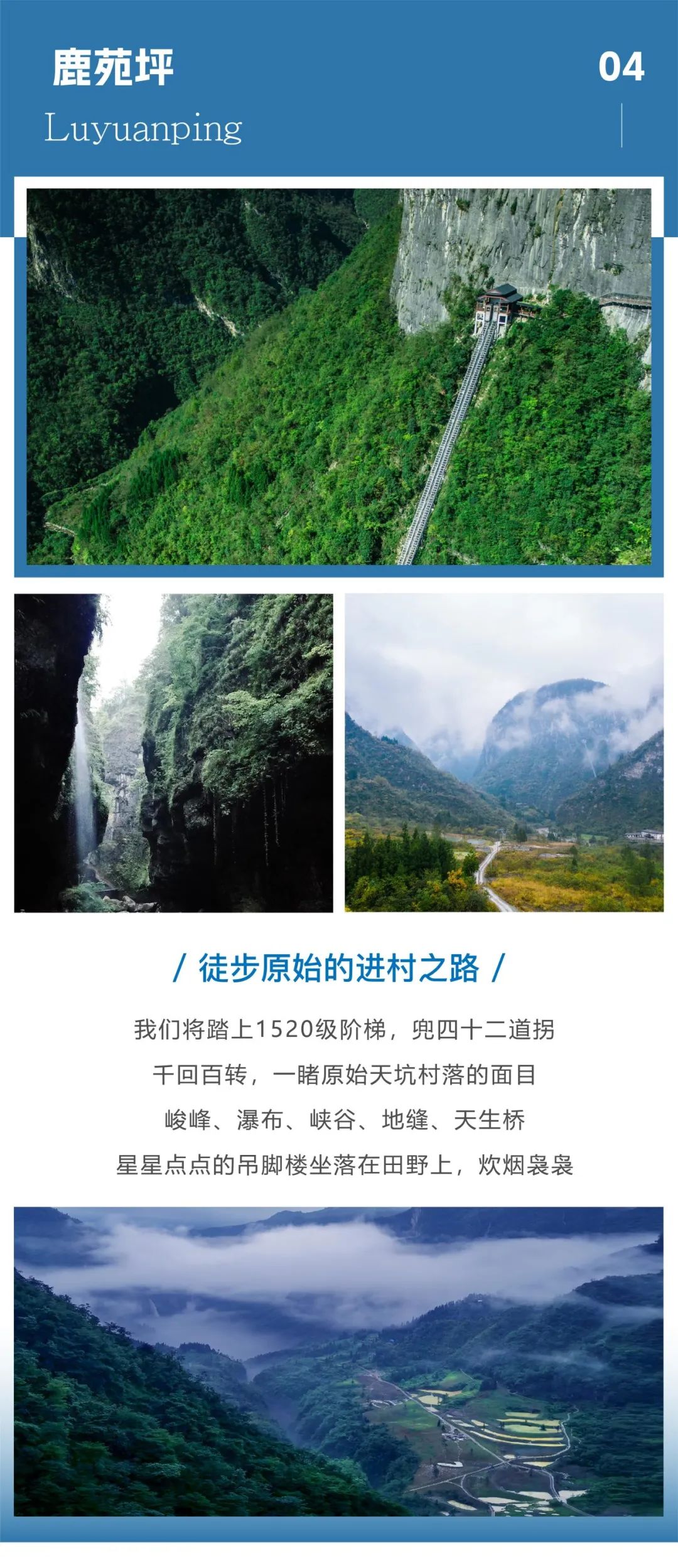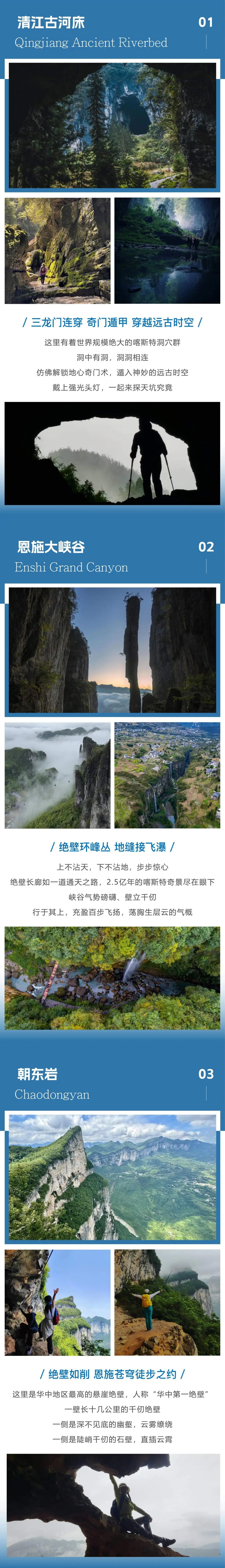 注:如果下大雨,徒步路线无法行走,则领队有权根据情况调整第2-4天行程顺序; 如考虑到安全原因,则有权调整为恩施景区,参考梭布垭石林景区。