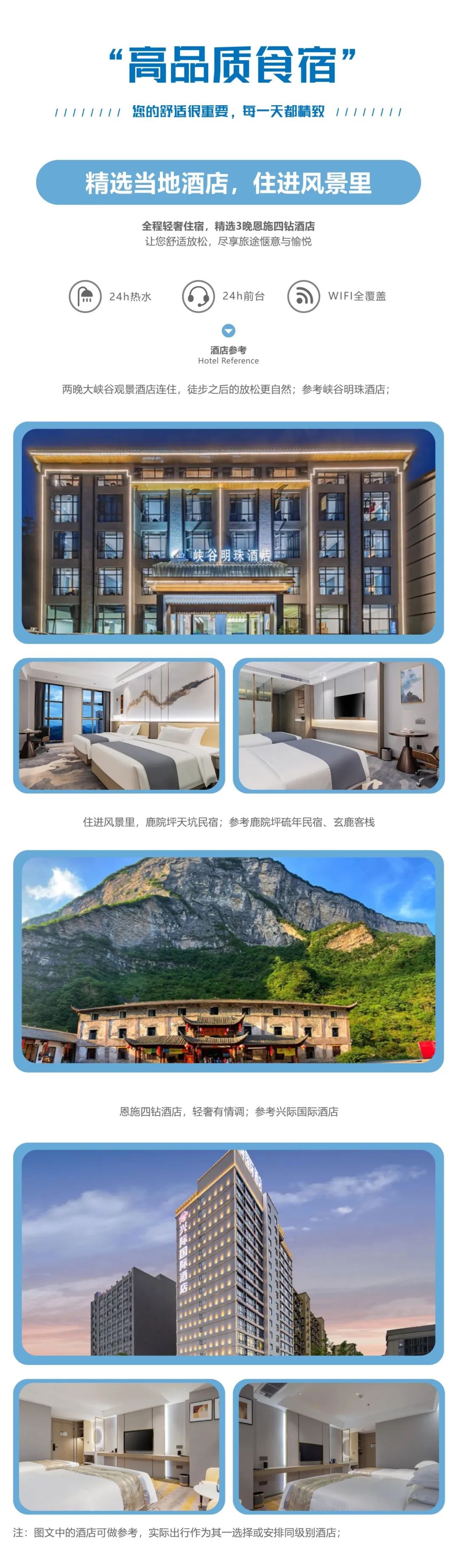 2.住宿:鹿院坪硫年民宿或玄鹿客栈1晚、大峡谷三星民宿2晚、恩施四星酒店1晚(参考住景国际酒店)1晚;