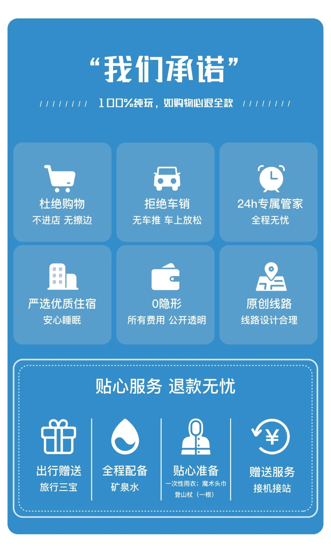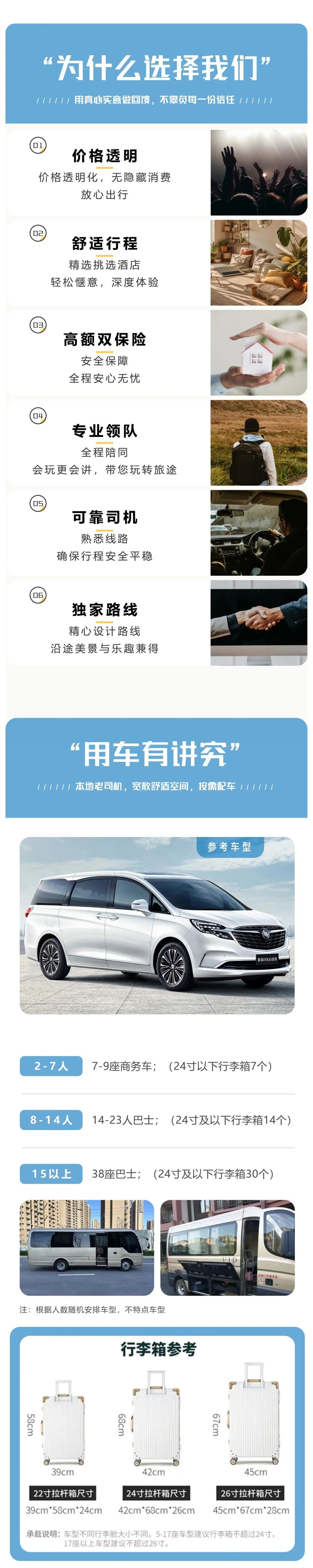 6.杂物:墨镜、保温杯、晕车药等杂物自行备好,另外建议也可以自备洗漱用品;