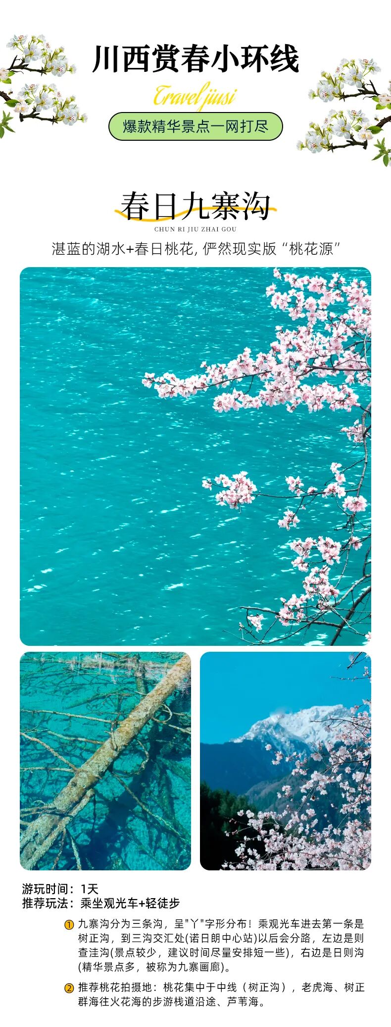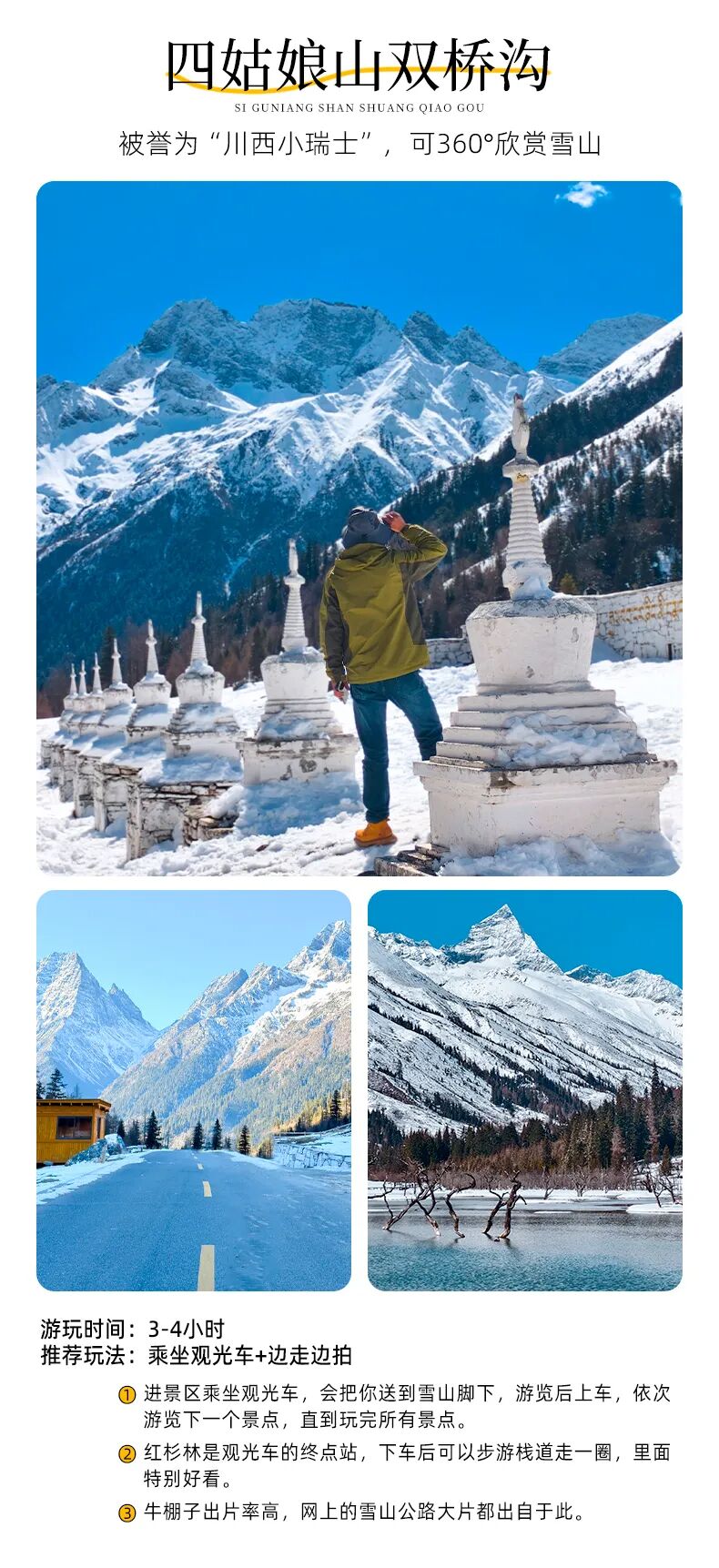 4、景交:四姑娘山双桥沟观光车70元/人(必须)、九寨沟观光车80元/人(必须)、桃坪羌寨老寨子门票60元/人(可选);