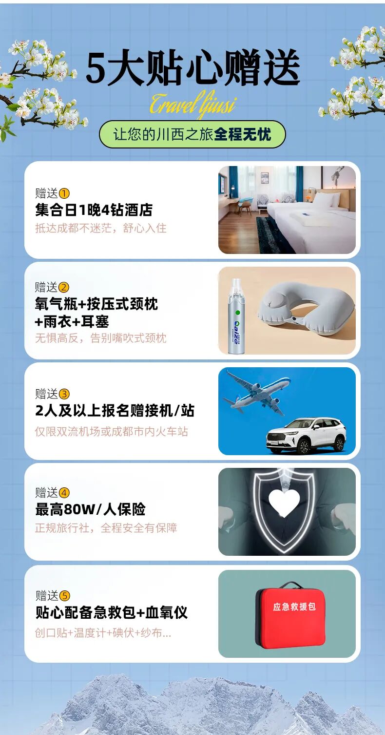 5、2人及以上报名赠成都双流机场接机/市内火车站接站(成都东站/成都南站/成都西站)1次,天府机场接机需自理费用。