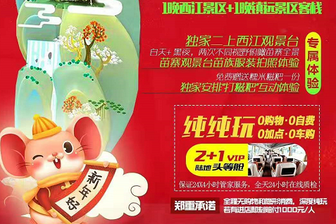 贵州全景大环游·至尊真纯玩·陆地头等舱保姆车 追寻自然地召唤,离开舒适圈,离舒适却并不远 怕购物团 选真纯玩 三排座椅·USB充电·可坐可躺 贵州唯一!全程0购物0加点0车销 全程无购物和隐形消费,深度纯玩,绿色纯净旅行体验 ★★★★★★★★★★★★★★★★★★★★★★★★★★★★★★★★★★★★★★★★★★★★★★★★★★★ 梵璞归臻 梵净山、黄果树大瀑布、西江千户苗寨、荔波小七孔、西江千户苗寨双飞六天 专属体验: 专属1. 精选陆地头等舱全新豪华保姆车,车内座椅2+1排,可座可躺,超大空间; 专属2. 独家定制精品旅游小包团,全团人数不超过29人, 全车标配USB手机充电接口; 专属3. 贵州精华5A景点大环线,不留遗憾,一网打尽,全部游览; 专属4. 独家安排二上西江观景台,分白天和黑夜两次不同视野俯瞰苗寨全景; 专属5. 保证入住西江景区苗寨吊脚楼客栈,绝不节省成本安排入住凯里; 专属6. 独家安排“打糍粑”互动体验,感受劳动的快乐,并免费赠送糯米糍粑一份; 专属7. 保证入住镇远古镇景区内部,夜游舞阳河美景,不起早,不赶路; 专属8. 黄果树景区VIP通道——检票免排队,0等待,直入景区! 独家定制: 定制1. 贵阳市区24小时接站服务,无缝衔接,风里雨里我在贵州等你; 定制2. 特别赠送西江千户苗寨观景台苗族特色服装拍照体验,留下难忘瞬间; 定制3. 定制饕餮美食,专属菜单,餐餐有惊喜,餐餐有特色,全面升级餐标; 定制4. 随车配备雨伞、手机充电宝、自拍杆、创可贴以及晕车贴等以备不时之需; 定制5. 游览天星桥景区上下两段全程,其他旅游团不去精华的下半段 定制6. 保证全程0购物0加点0车购,全程无任何购物和隐形消费; 保证7. 保证24X6小时管家服务,全天24小时在线质检; 保证8. 保证两年以上正规持证导游服务,绝不推荐自费和购物,耐心讲解,态度良好。 ★★★★★★★★★★★★★★★★★★★★★无人数无年龄无地域限制★★★★★★★★★★★★★★★★★★★ | |||