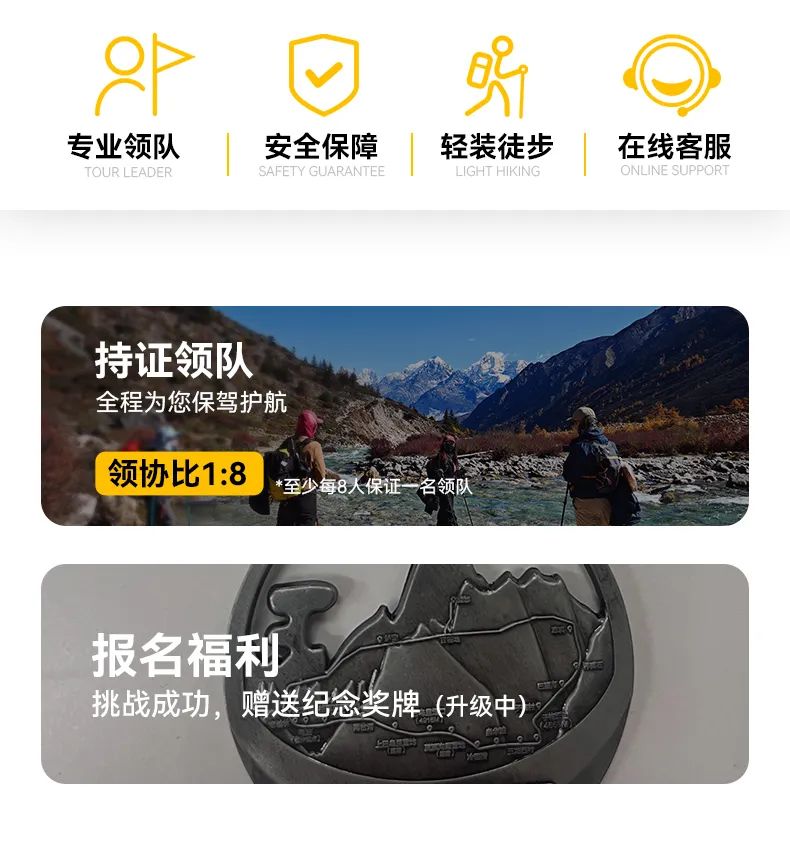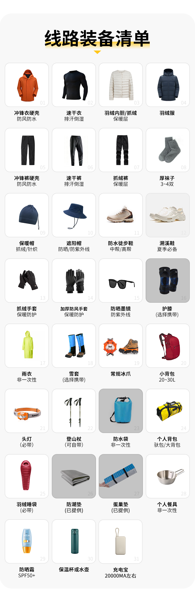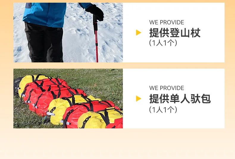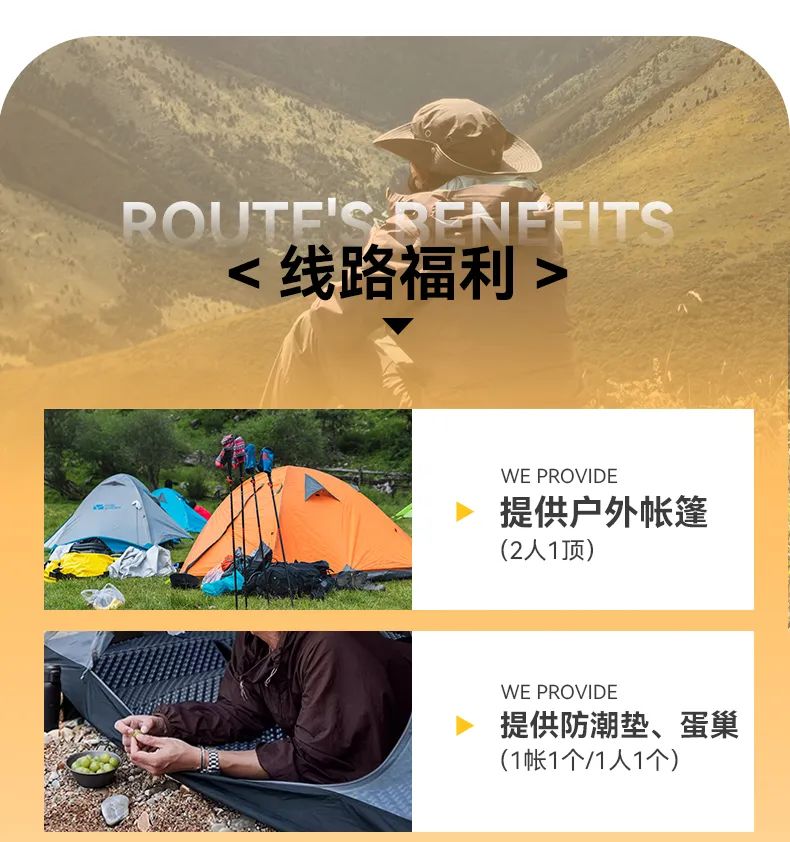 超限行李费(每人限重15KG) | ①大于等于15KG小于等于20KG,无费用增加 ②大于等于20KG小于等于30KG,费用500元 ③大于等于30KG小于等于40KG,费用1000元 ④大于40KG,费用1500元 (行李的定义是您交由马匹驮运的行李重量,个人背负或者另请背夫的行李重量不计)由于除睡袋以外的露营装备以及徒步过程中的餐食(路餐除外)所有的徒步装备和物资由俱乐部统一准备; |