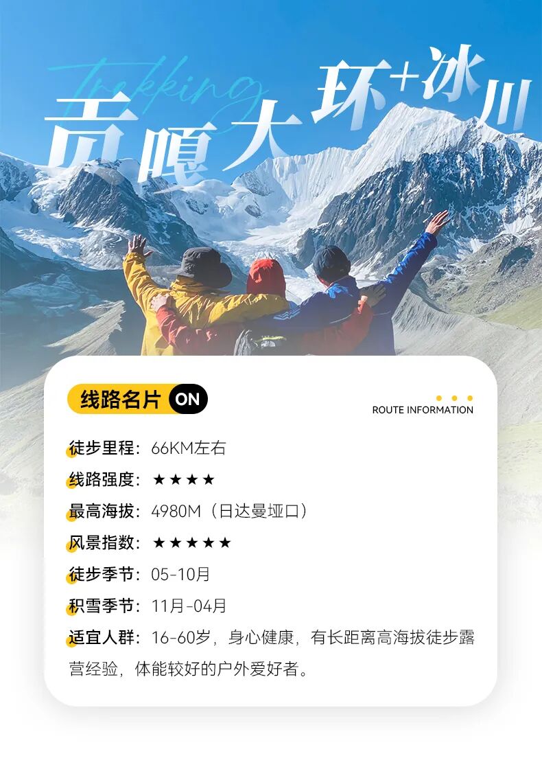 行程概览:今天是艰苦的一天,翻越4980米的日达曼垭口,这个垭口鲜有人知,更别说走过的人少之又少,翻过垭口一路沿着河谷下降,抵达日达曼牧场,到这里我们本次露营就结束了,合照留影,再乘车前往客栈休息。下午时间充足可自愿乘坐当地中转车前往子梅垭口观贡嘎日落,运气好的话还可以看到日照金山等壮观景象。