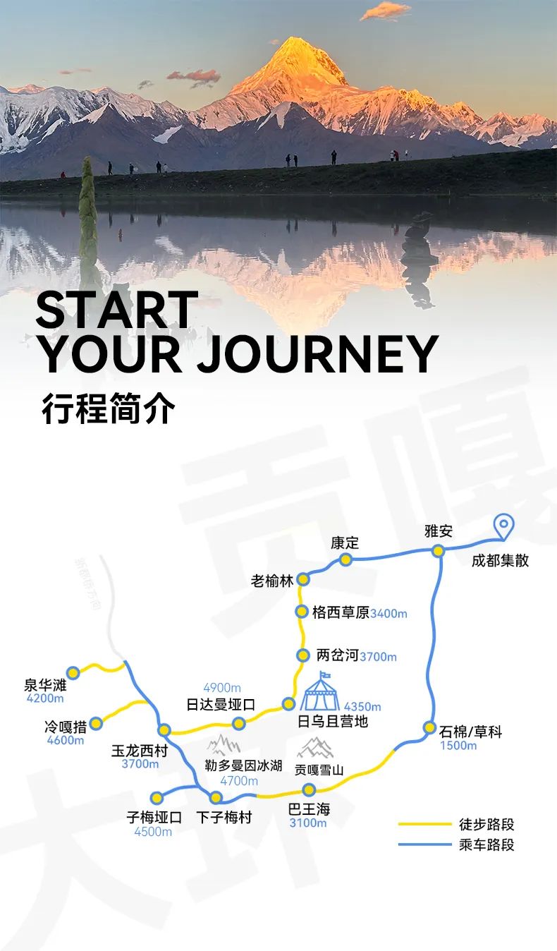 2. 今天全程大约14公里左右,海拔跨度很大(最高4980M,最低3700M);如果发生高反或身体不适,请及时联系领队。