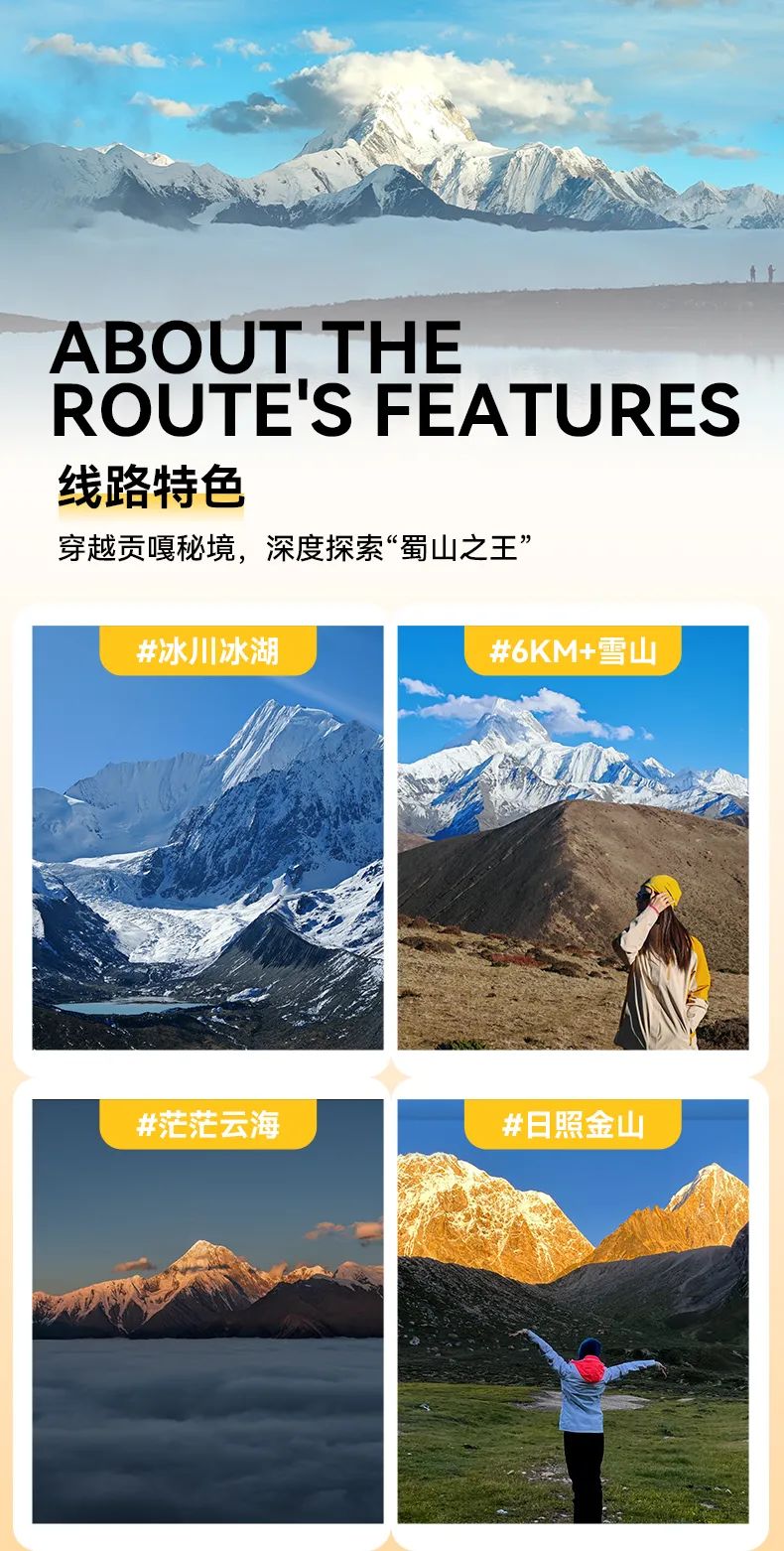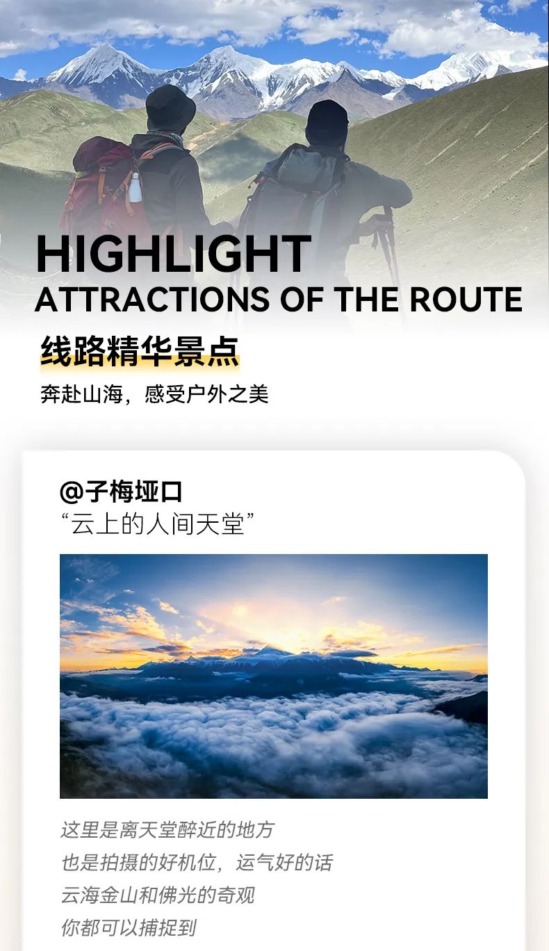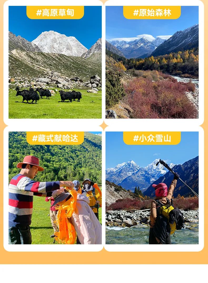 行程概览:今日早起,收拾整备完毕,乘车前往子梅垭口观看日出,从另一个角度拍摄贡嘎山,这也是离贡嘎最近的一个观景平台,可以在这里拍摄到星空、云海、日出、佛光,之后乘车下山前往下子梅村,今日为徒步最后一天,不仅风景美,徒步还很轻松。沿着河边一直穿行在原始森林当中,你会看到密密麻麻的沙棘树和上百年的灌木林,中午在巴王海吃路餐、拍合照后,我们即向本次徒步的终点巴王海停车场进发。