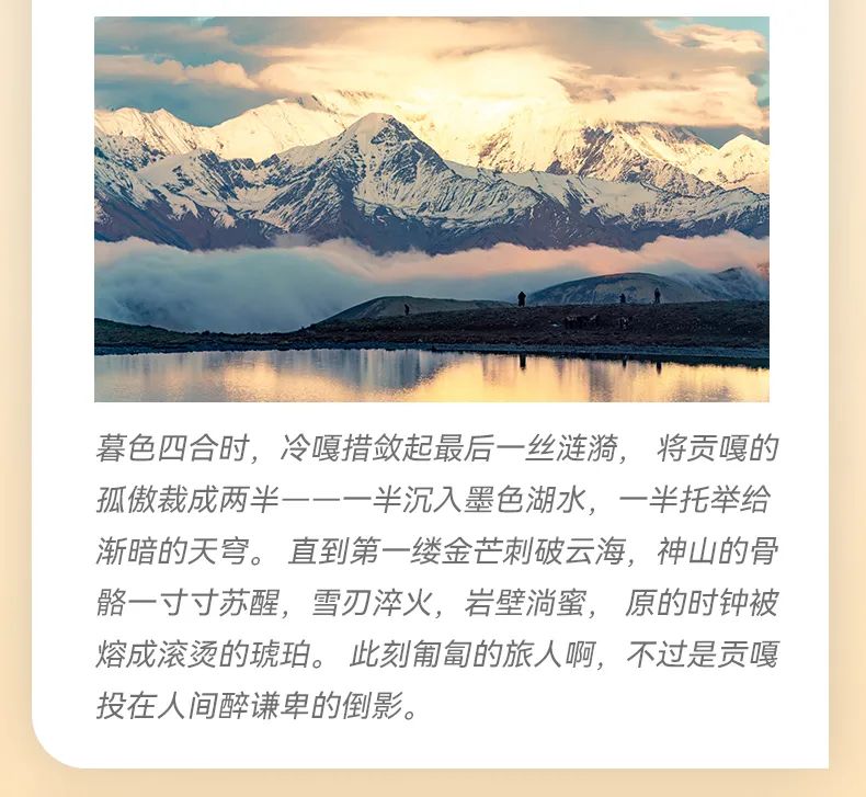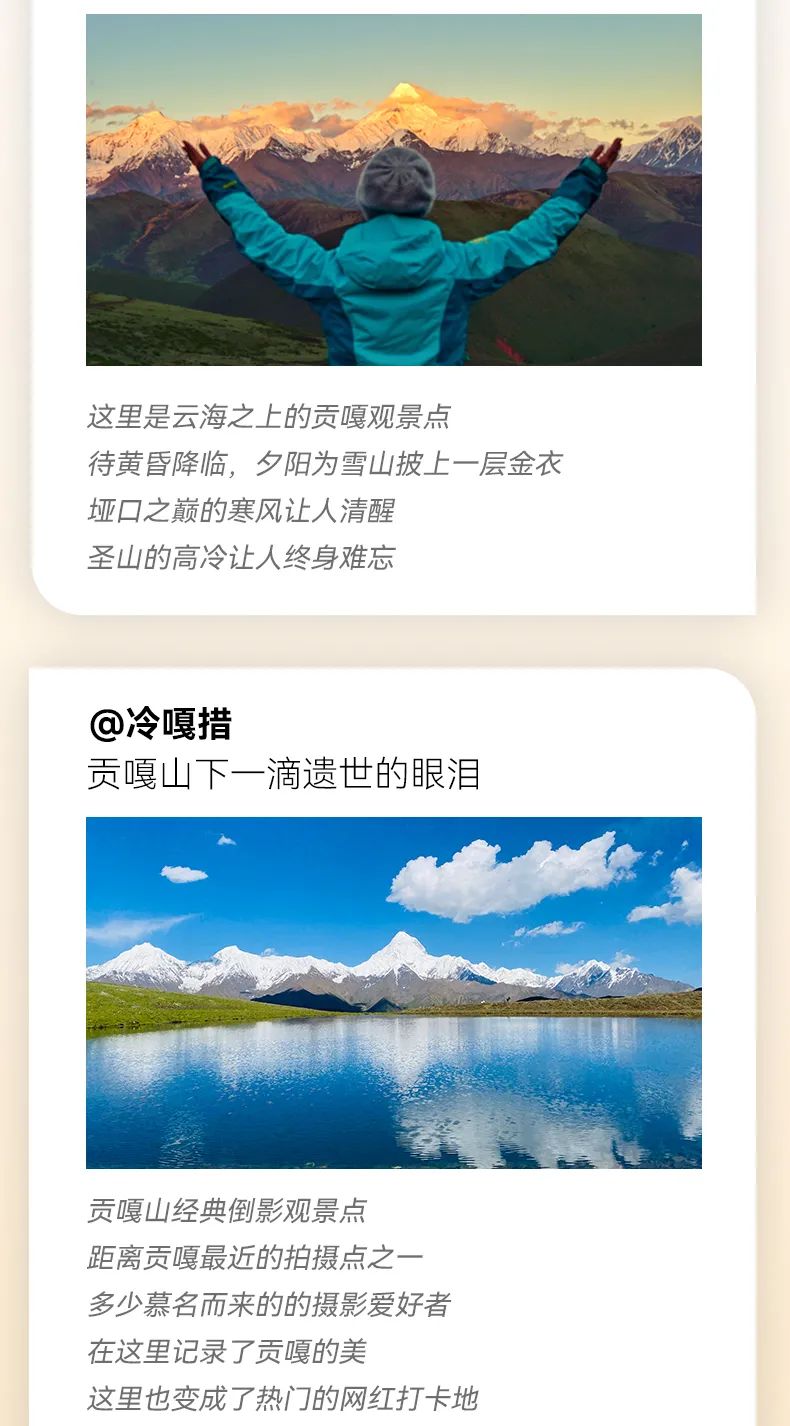 行程概览:早餐后前往泉华滩景点,徒步1个小时上到达泉华滩进行拍摄,泉华滩类似黄龙的五彩池,有着“小五彩池”之称,拍摄完毕原路返回山下,乘坐当地中转车送至冷嘎措山脚下。穿行在灌木林的山谷直至垭口,巍峨的贡嘎群山就在背后,一路背对嘎山前行。向上攀爬,视野也愈加开阔,壮美的景色让人舍不得挪开脚步。再横切一小段就是冷嘎措了,我们在湖边占据最佳摄影点,拍摄贡嘎山千变的容颜,拍摄完之后徒步下山,乘车返回上木居入住。