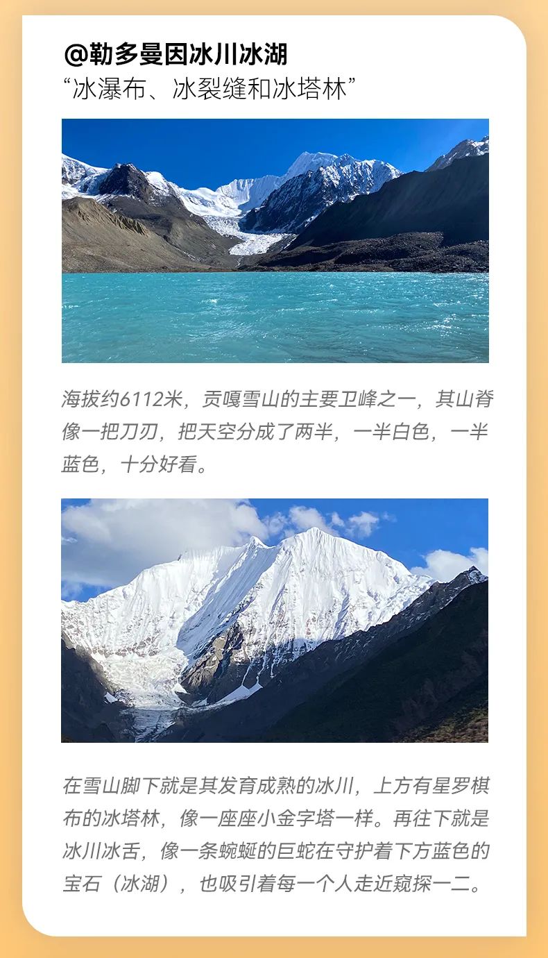 行程概览:今日时间很充足,吃完早餐出发冰川,可以在湖边拍摄勒多曼因雪山和宛如蓝宝石的冰湖,抵达冰湖后带上冰爪前往冰川上徒步探险,近距离的接触冰川、冰塔林和神秘的雪山,探秘勒多曼因冰川,下午2点开始返回营地。