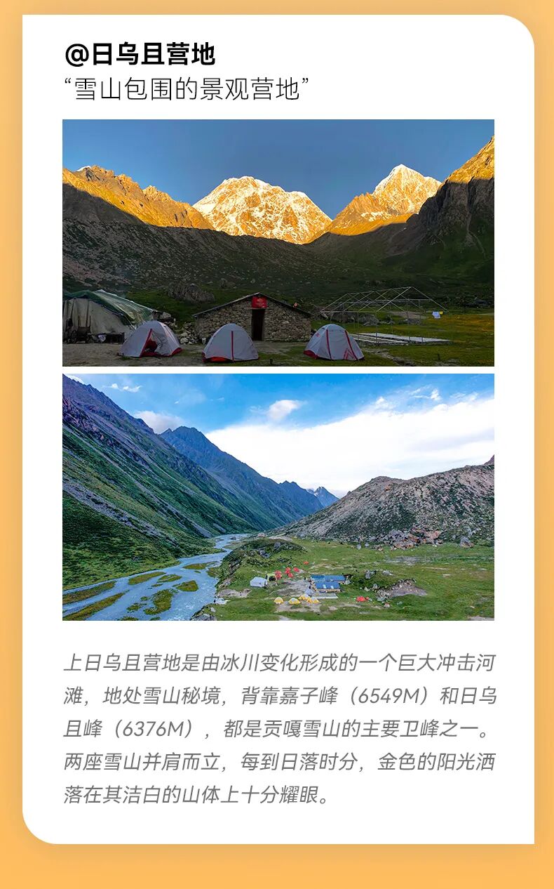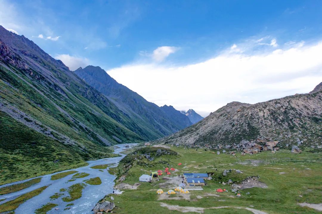 行程概览:早餐后向上日乌且方向进发,沿途欣赏壮美的高原风光,中午到达两岔河,河对岸隐约出现大面积红石滩,领队带领大家稍微驻足拍照。一路向南,沿途欣赏田海子雪山(海拔6070m)、小贡嘎(海拔6027m)、嘉子峰(海拔6549M),下午抵达上日乌且扎营。