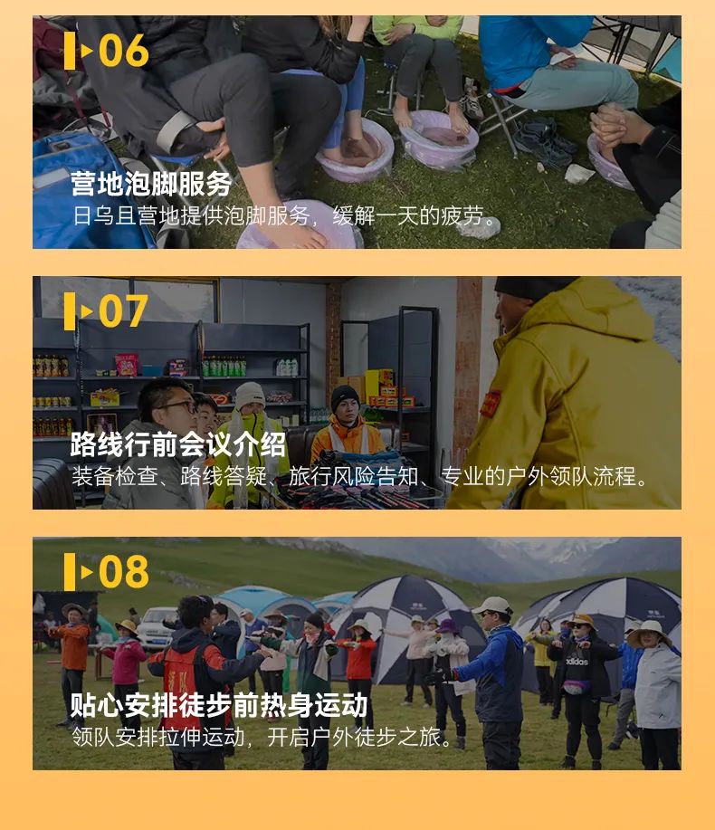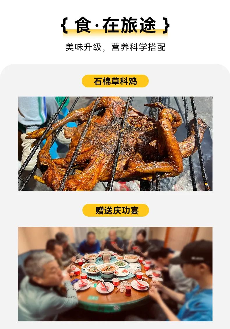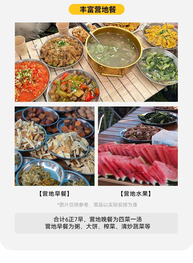 3.餐食:全程所列餐食合计6正7早,包含营地早餐、晚餐。营地晚餐为四菜一汤,营地早餐为粥、大饼、榨菜、清炒蔬菜等。