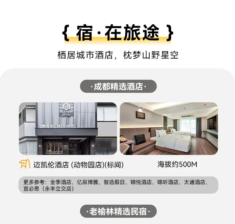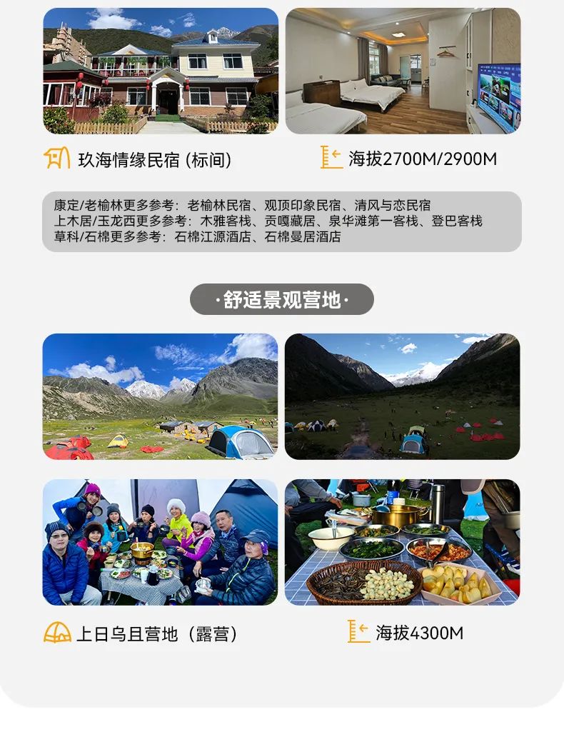 (其中:①老榆林民宿1晚;②上木居或玉龙西藏家2-3人间2晚;③石棉精品酒店住宿1晚;④营地露营两晚;⑤成都酒店一晚。)