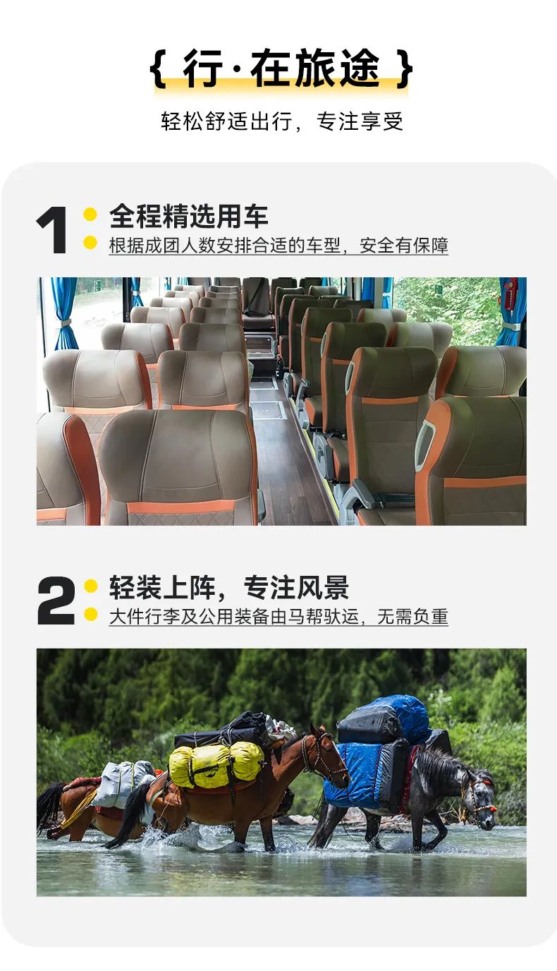 2.上木居-冷嘎措需要乘坐20分钟中转车;冷嘎措山高路陡,体力不佳者可以考虑骑马(参考费用单边200元/人)。