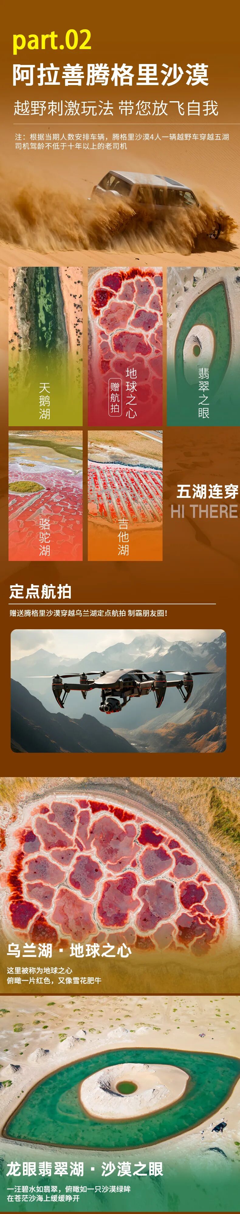 08:00早餐后换乘越野车前往【腾格里沙漠越野穿越五湖】,同时赠送【乌兰湖定点航拍】,体验沙漠越野冲浪的激情体验。