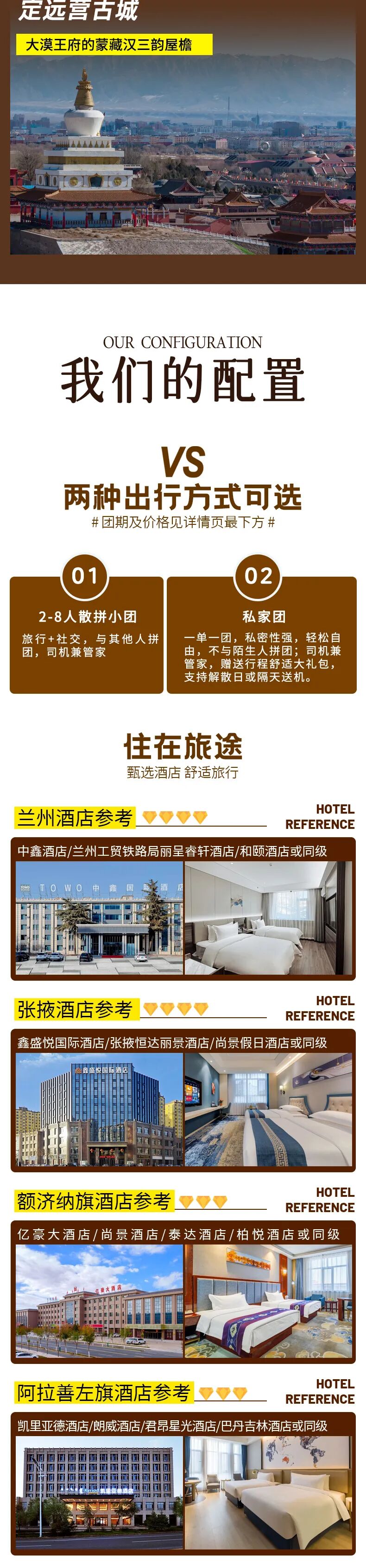 1、住宿:兰州4钻/星酒店标间1晚、张掖市4钻酒店标间1晚、额济纳旗3钻酒店标间2晚、阿拉善左旗3钻酒店标间1晚;