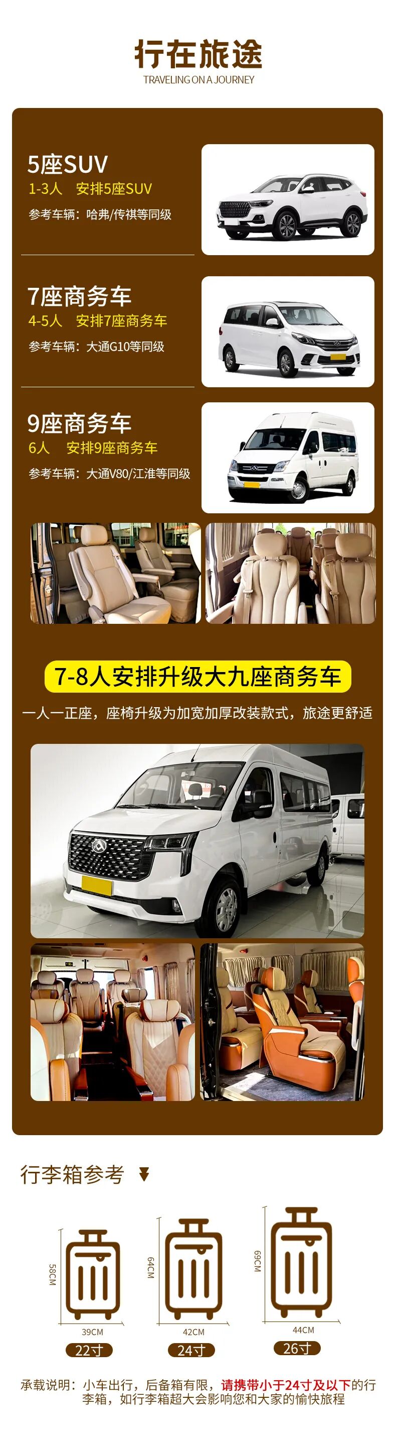 3、交通:1-3人用5座SUV,4-5人用7座商务车,6人用普通9座商务车,7-8人用改装大九座商务车(小团副驾驶及前后座位置需要轮流乘坐,望悉知),腾格里沙漠4人一辆越野车穿越五湖;
