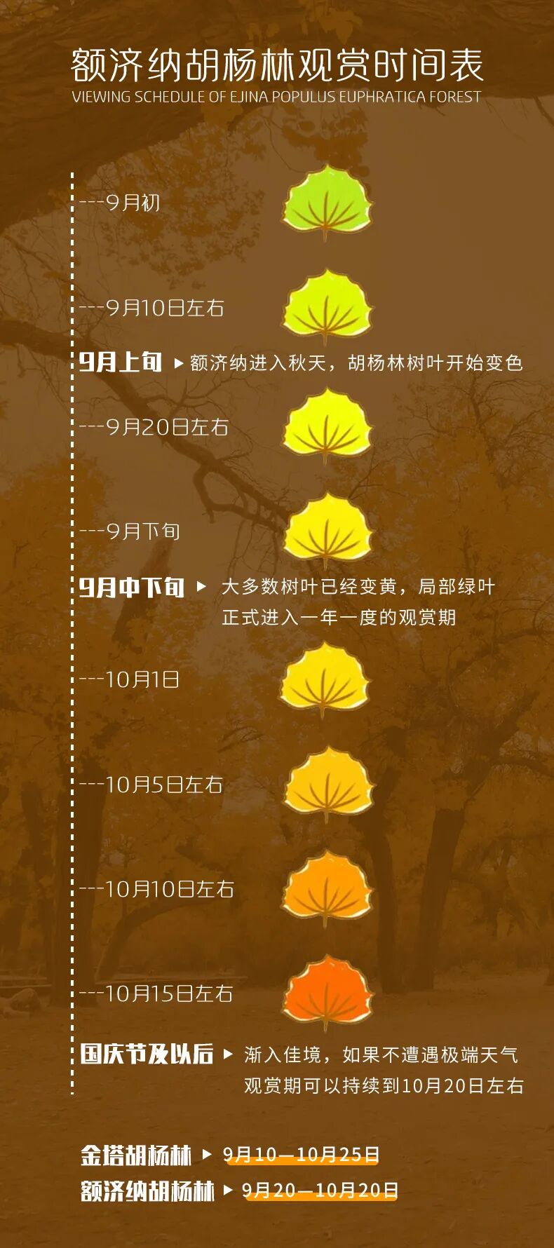 黄叶叶子变黄、与气温、温度、湿度、树龄等都有关系。一般来说,最低气温降至5度左右时开始有黄叶,水分少的区域先黄、树龄少的叶子先黄。根据往年经验,每年9月10日左右开始有局部的黄叶,每年的9月20号左右正是胡杨叶转红的时间,10月初至中旬,胡杨叶子黄得最亮丽,林子多数都是黄的,要求几十万亩的林子完全变黄基本不可能的哦。如果天气稳定,黄叶可以持续到10月中下旬,如果寒流频繁,就会提前落叶,敬请谅解。