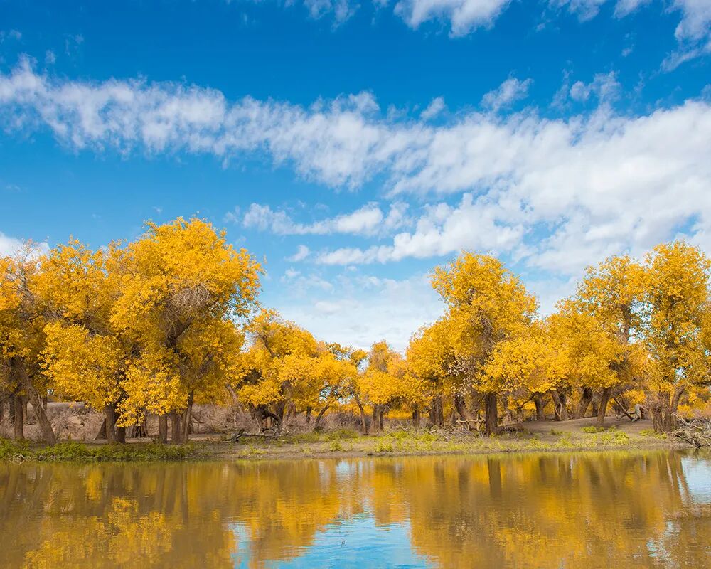 09:00出发前往【额济纳胡杨林】(全天畅玩),这里的美景因张艺谋《英雄》而名声大起。从二道桥到八道桥,这里有看不到尽头的胡杨林、红柳海,瑟瑟秋风中的胡杨林早已变成一片金黄,,金秋时节漫步辉煌的金秋胡杨林,捕捉千姿百态的胡杨美景。保护区内的一道桥至八道桥,分布着不同的胡杨景观,是摄影爱好者的天堂。八道桥的巴丹吉林沙漠北缘,沧桑醉人心魄。你也可以找寻一树三叶的神奇景象:“幼树叶如针似柳眉、壮龄树叶酷似白桦、老年树叶椭圆。”