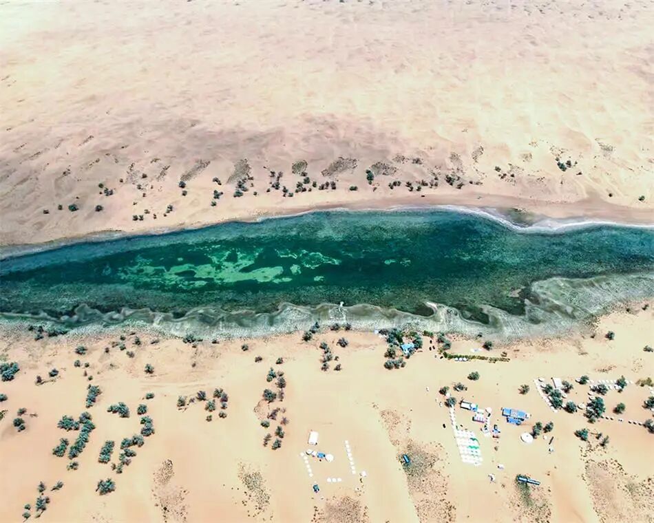 沙漠之眼:一汪碧水如翡翠,俯瞰如一只沙漠绿眸在苍茫沙海上缓缓睁开。