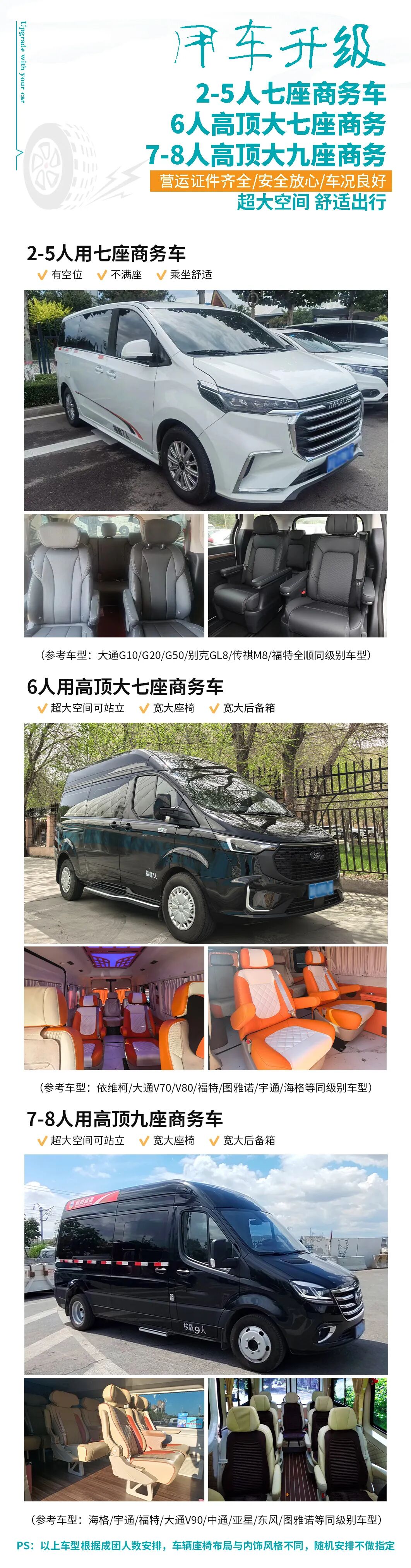 【交通】全程5天用车费用。2-5人用七座MPV商务车,6人用高顶大七座商务车,7-8人用高顶大九座商务车(含司机、油费、过路费、停车费,司机食宿);具体车型根据人数安排,不接受指定车型,拼车全程座位需轮流换座。车辆空间有限,请携带不超过24寸的行李箱。