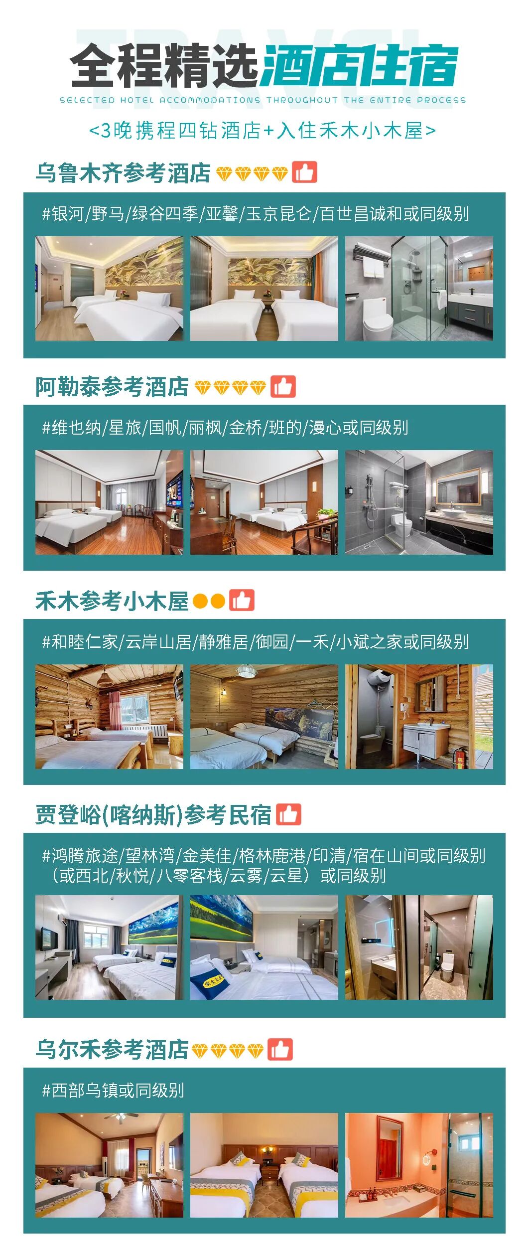 其中3晚携程4钻住宿,1晚禾木小木屋,1晚贾登峪或喀纳斯普通住宿。