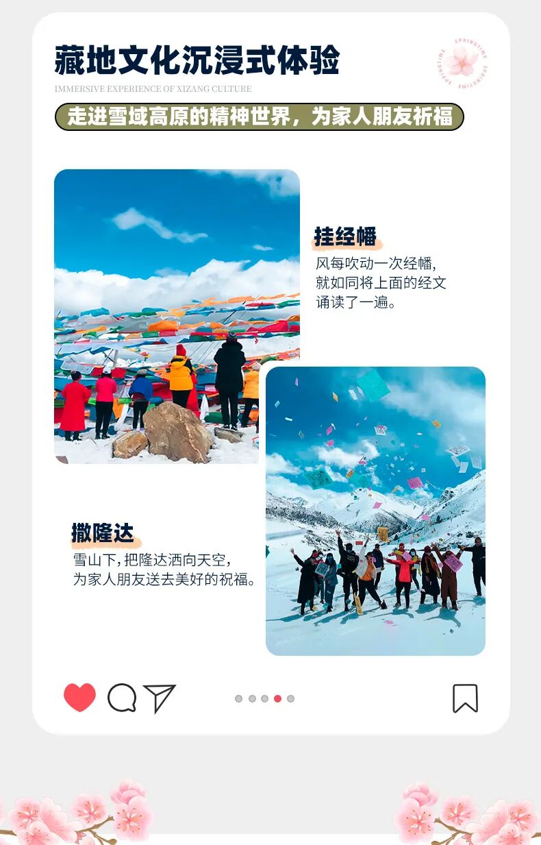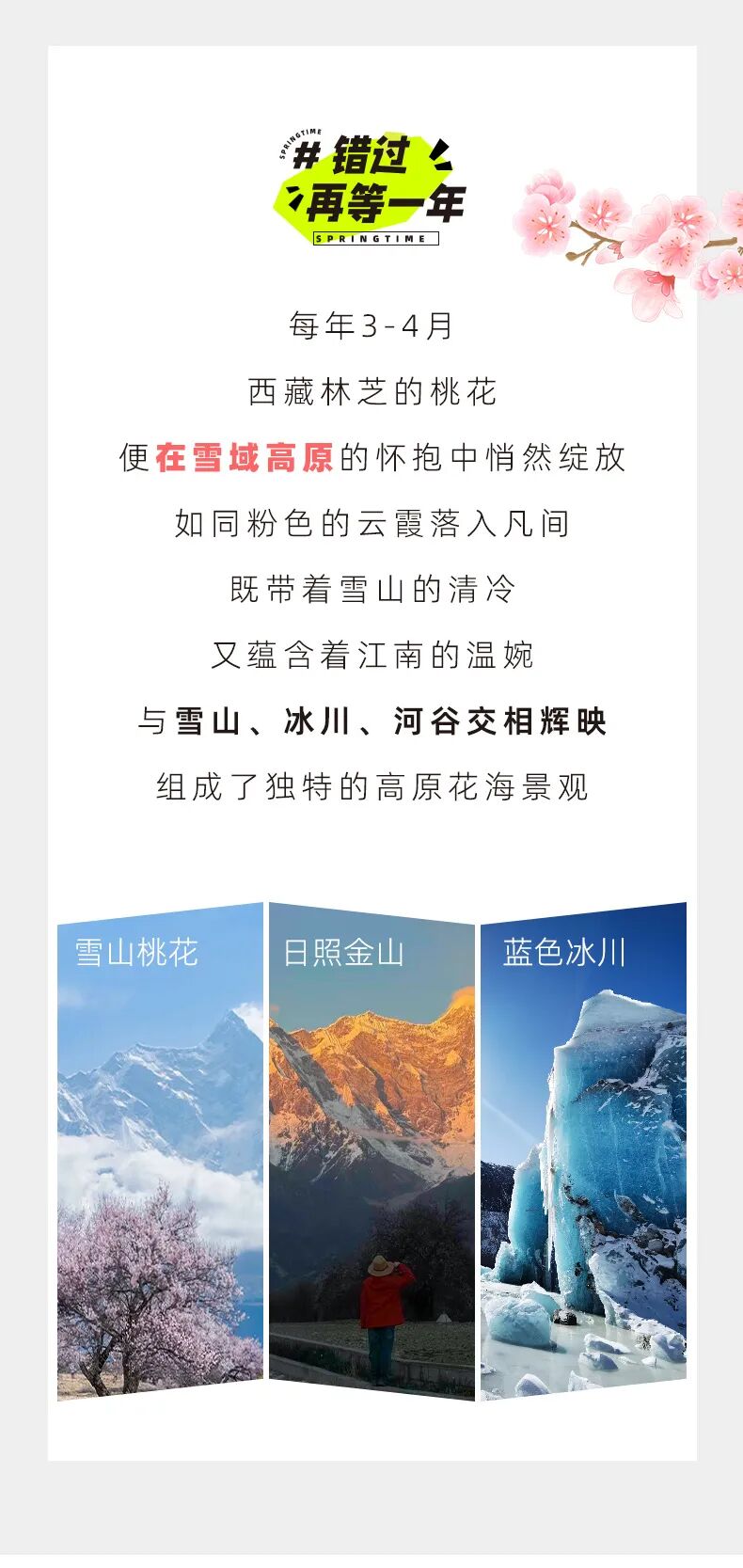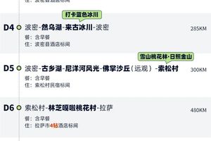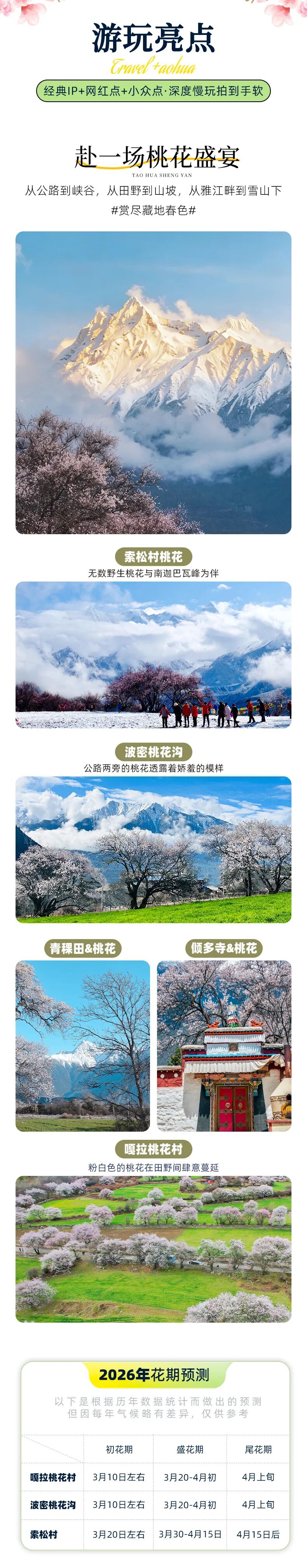 【行程概述】早餐后沿318前往【古乡湖】,古乡湖是离波密县城33公里的一个堰塞湖,由于风景优美、紧邻318线,也一直被驴友作为必游的一个休闲景点。游玩后继续西行,来到318线最精华的部分——波密至林芝段,一幅幅美景不时从车窗外飘过,保证让你惊叹。翻越色季拉山早餐后从林芝出发,沿途欣赏美丽的【尼洋河】风光,三月的尼洋河有了桃花的点缀,更是美妙绝伦。到达丹娘乡就可以看到雅江对面一个神似佛掌的沙丘。一路欣赏桃花,边走边拍,如果天气晴朗便能看到南迦巴瓦峰的倩影,而后抵达雅鲁藏布江大峡谷景区游客中心,买票后乘车前往【索松村】,这是一个与大峡谷景区隔江相望的小村落,坐落在几百米的悬崖上,下面是滔滔不绝的雅鲁藏布江,对面是“中国最美十大雪山”之首的【南迦巴瓦峰】,春暖花开正当时,粉白色的桃花肆意绽放,醉在其中。如果天气晴朗,傍晚还可以守候南迦巴瓦峰的日照金山。当夜晚来临的时刻,藏家民宿内促膝畅谈,我想,这样的夜晚,必定一生难忘!