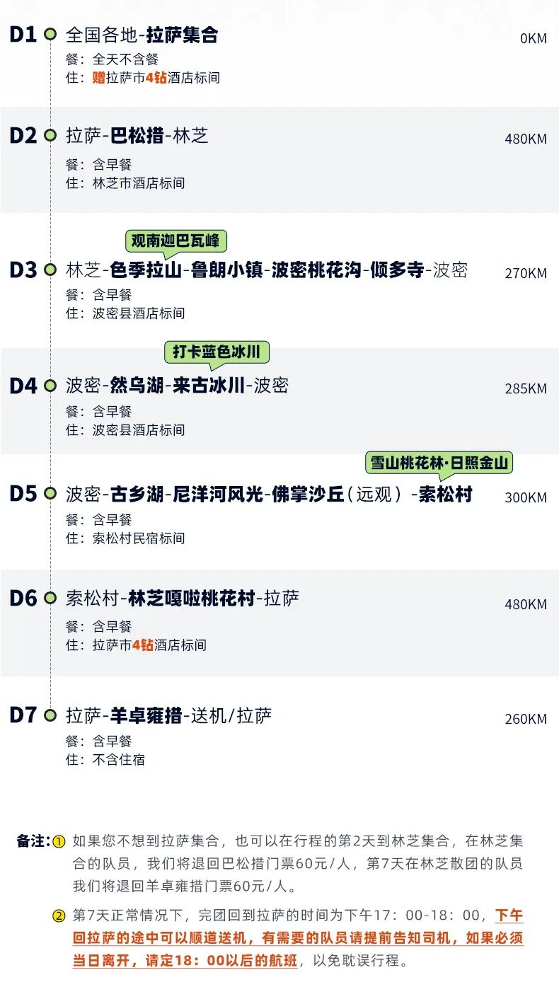 (1)以上行程及时间可能会因天气、路况等原因做相应调整,具体以实际出发行程及时间为准。正常情况下完团回到拉萨时间为下午17:00-18:00,下午回拉萨的途中可以顺道送机,有需要的队员请提前告知司机,如果必须当日离开,请定18:00以后的航班,以免耽误行程;(2)拉萨散团日当天不含住宿,如需代定,请提前联系客服。