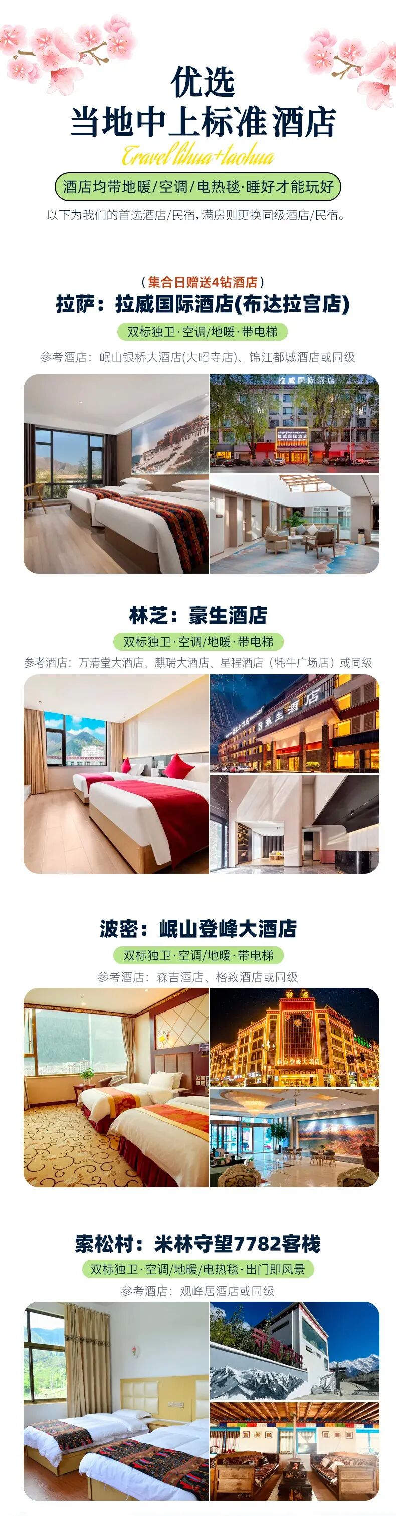 (3)到集合酒店报“大美林芝+姓名”拿房,房费已付,押金自付。入住酒店的时间一般在集合日当天的14点以后,如果您提前到达且酒店房间未整理出来无法办理入住,可将行李暂时寄存在前台,先在市区周边自由游玩;