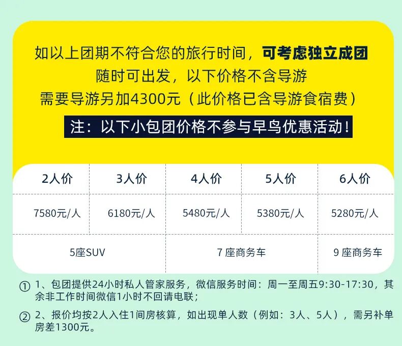 (2)8人精品小团:全程司机兼向导,已含驾驶员食宿、油费、过路费,驾驶员熟悉线路,会给队员提供行程建议,但不会像专业导游一样解说,且不陪同队员进景区,请理解;