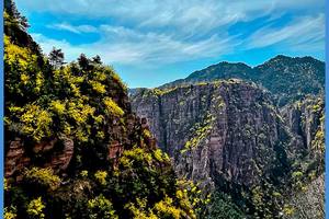 从南寨前往天柱沟我们乘车,沿途能欣赏到南太行的乡村风光,有农田、村落,远处是连绵的太行山。进入天柱沟后,首先打卡 “天柱”,一柱擎天的壮观石柱,柱顶有棵翠树,从不同角度看有不同的形态。会路过一些废弃的村庄,如葫芦双,可以看到雄浑的太行红色石柱、碧玉般的柿园水库,还有蜿蜒的林间小路。途中可能会经过一些古老的石板路、石屋等,感受当地的历史韵味。到达秋沟最高点三山垴,这里可以俯瞰周围的群山和桃花美景。