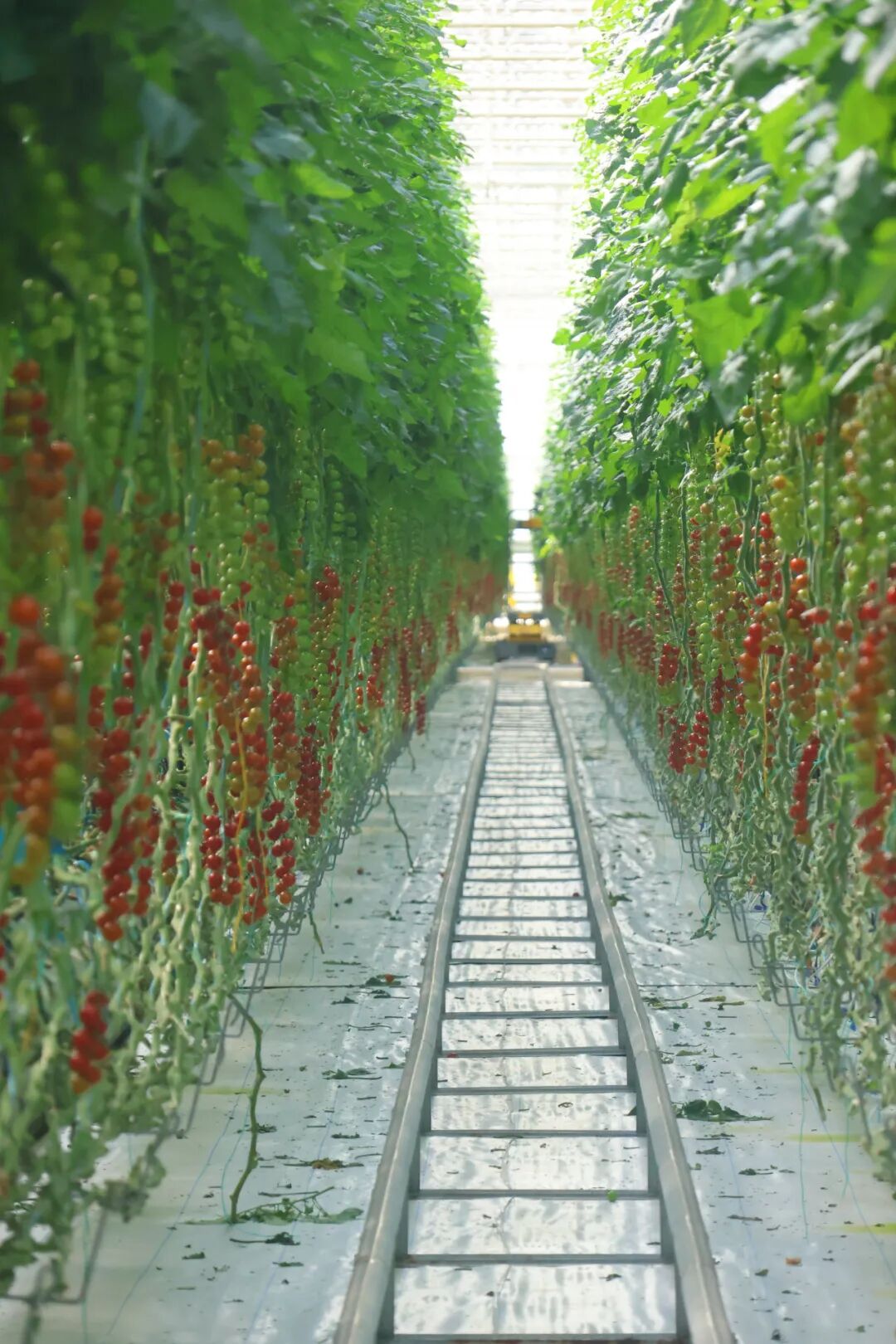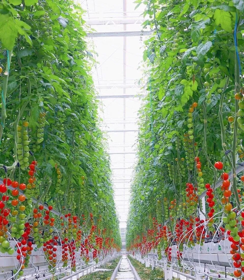 欢迎来到小番茄的“阳光玻璃城堡”!看这一排排整齐的番茄苗,就像在走绿色的阅兵大道——这里全年都是暖暖的春天,阳光透过玻璃天花板洒下来,番茄宝宝们每天都能做日光浴哦!