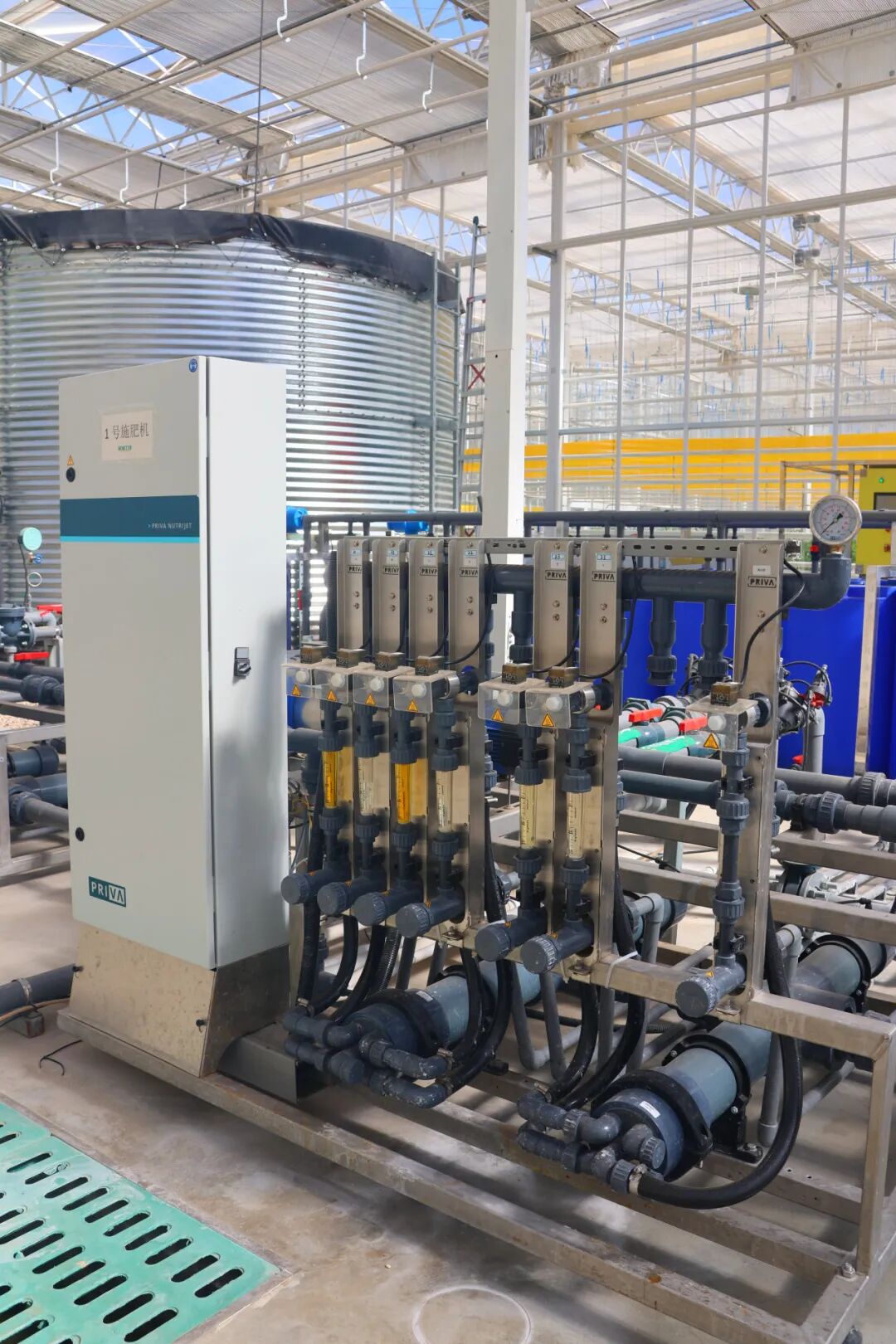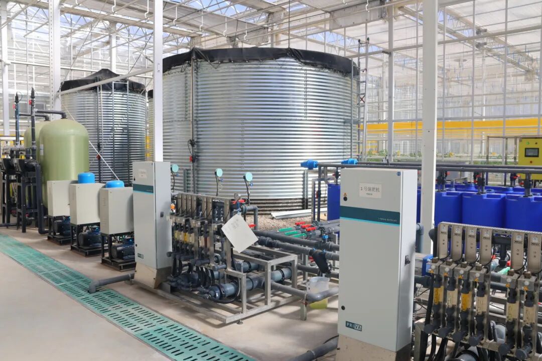 欢迎来到“蔬菜的秘密中央厨房”!眼前这些银光闪闪的大罐子和纵横交错的管道,可不是什么科幻电影道具——它们组成了整个温室的智能生命线:水肥一体化超级系统!看,那台RO反渗透机就像个“超级净水器”,把普通水变成植物最爱喝的“纯净水”;旁边的施肥机则是个“精准配餐师”,每天为番茄宝宝特调16种营养元素的“活力奶昔”;而紫外线消毒机则是隐形的“健康卫士”,默默守护着每一滴营养液的新鲜安全!悄悄告诉你:这里的每株蔬菜,都拥有一位24小时在线的“专属营养管家”哦! 🌱✨