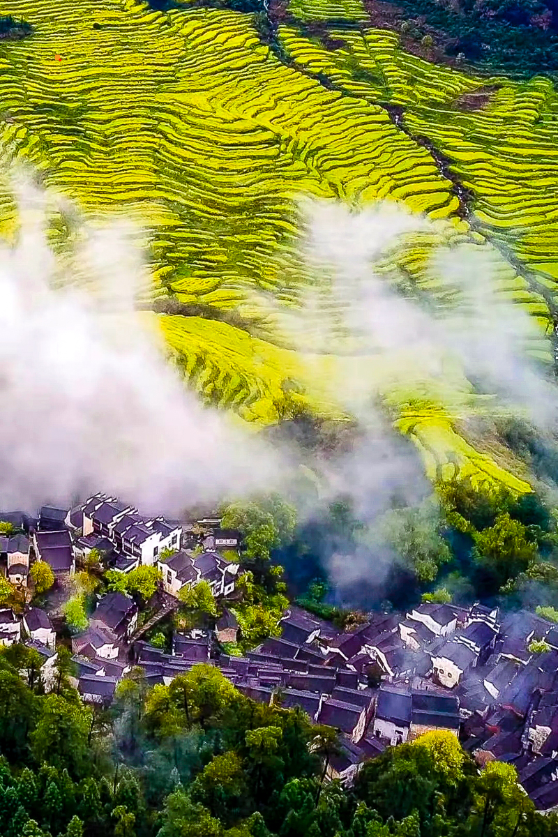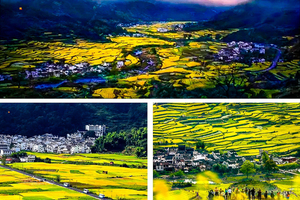 婺源的油菜花就是这样一种意韵。婺源被誉为"中国最美的乡村",婺源最美的季节是油菜花开放的时候。余邵诗云:“油菜花开满地黄,丛间蝶舞蜜蜂忙;清风吹拂金波涌,飘溢醉人浓郁香”。油菜花成为吸引观光的最佳绿色资源,花粉中含有丰富的花蜜,常引来彩蝶与蜜蜂飞舞于花间,由此平添了乡间田园缤纷的景致。三月至四月,棵棵粉红的桃花、洁白的梨花点缀在漫山遍野金黄色的油菜花中,掩映着白墙灰瓦的徽派建筑,使得每一个逃离纷繁城市的人都能找到归宿。