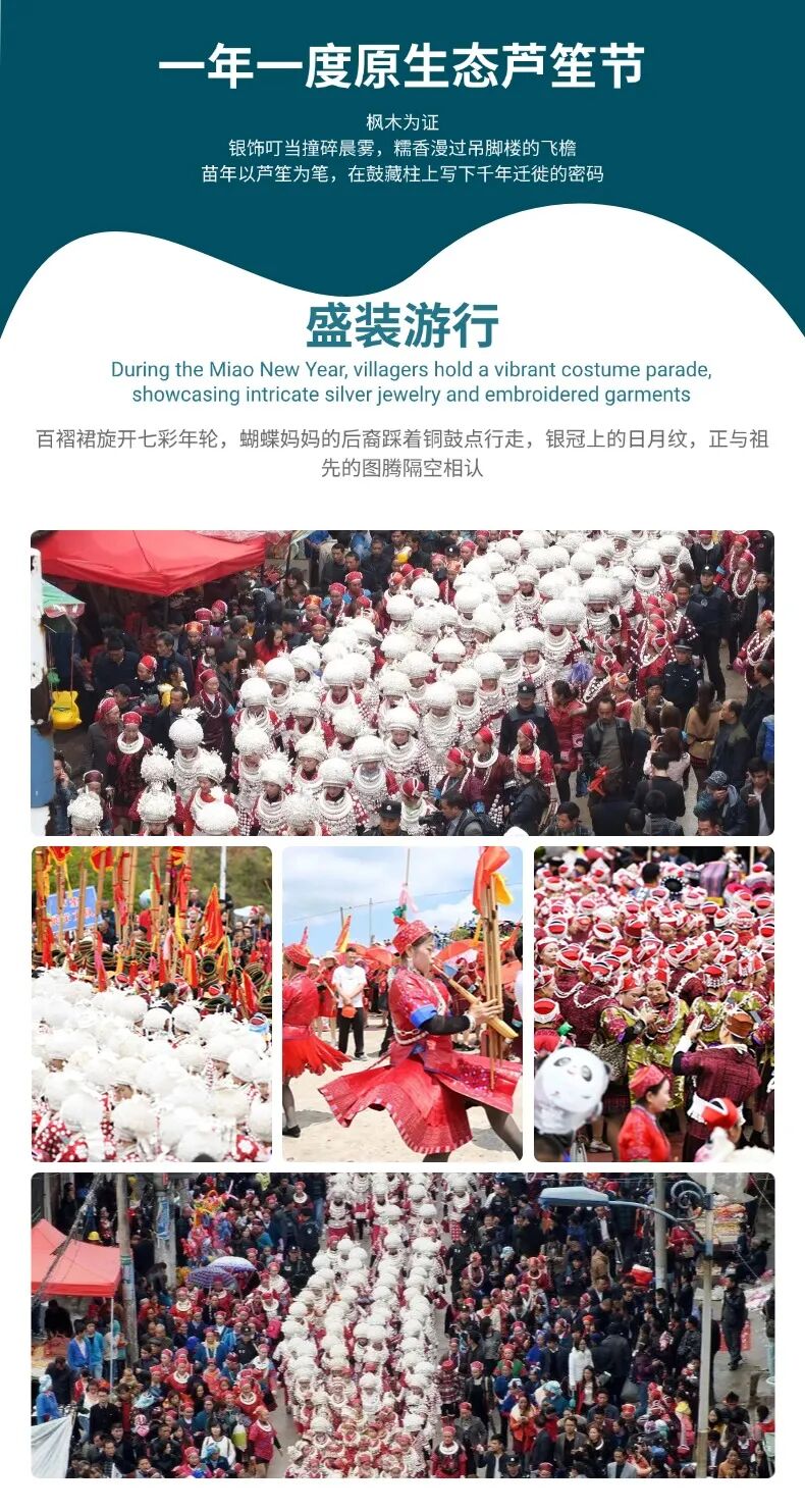 行程的重头戏,参加一年一度黄平芦笙节,其由来与历史可追溯至苗族古代传说和农耕文化传统,传说古代青年垢科为营救被狗怪掳走的恋人阿幼,带领村民以芦笙和板凳舞为武器诱杀妖怪。后人于农历九月二十七日设立庆典复现抗争场景,逐渐形成固定节俗。另有研究认为,芦笙节源于苗族原始宗教集会,与自然崇拜(如雷公、龙王)及祖先崇拜(如蝴蝶妈妈)密切相关