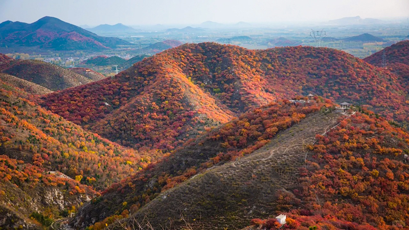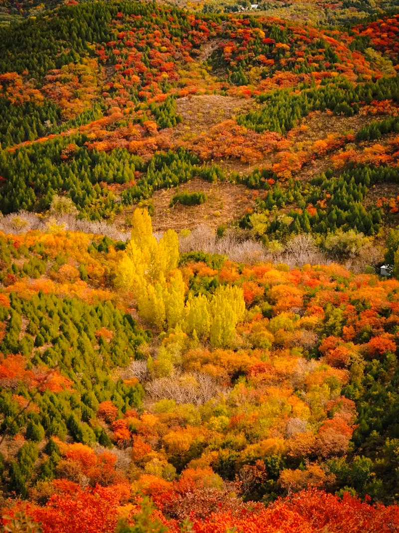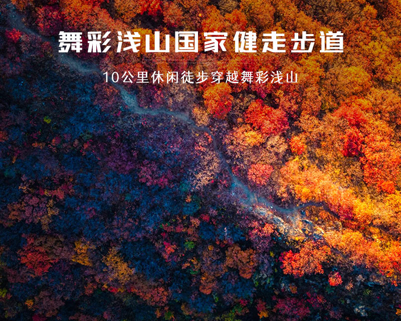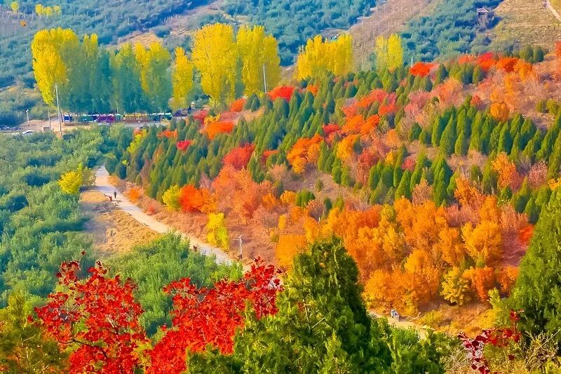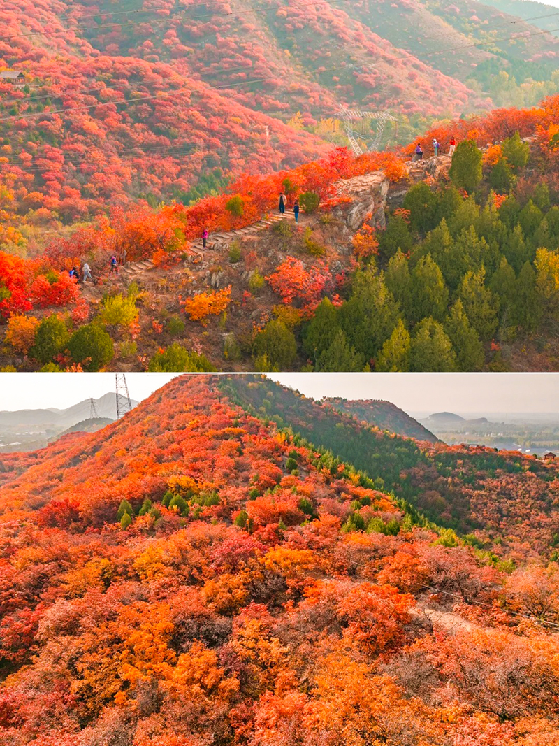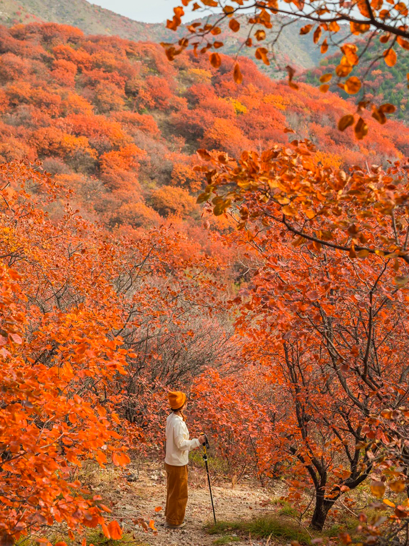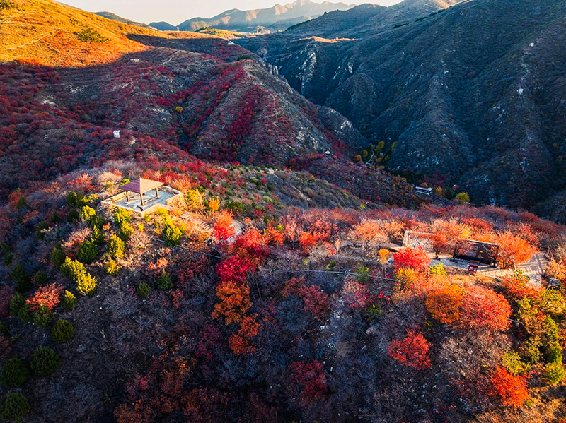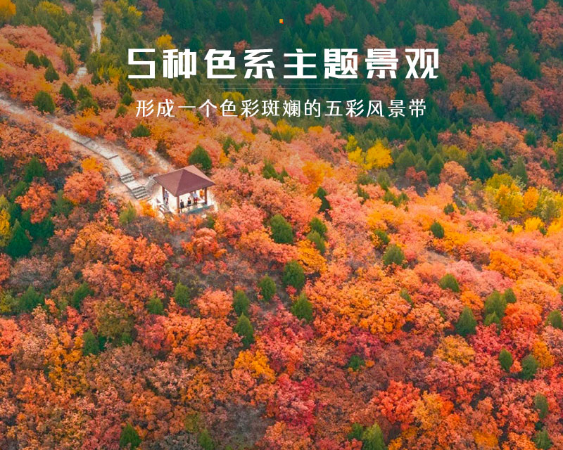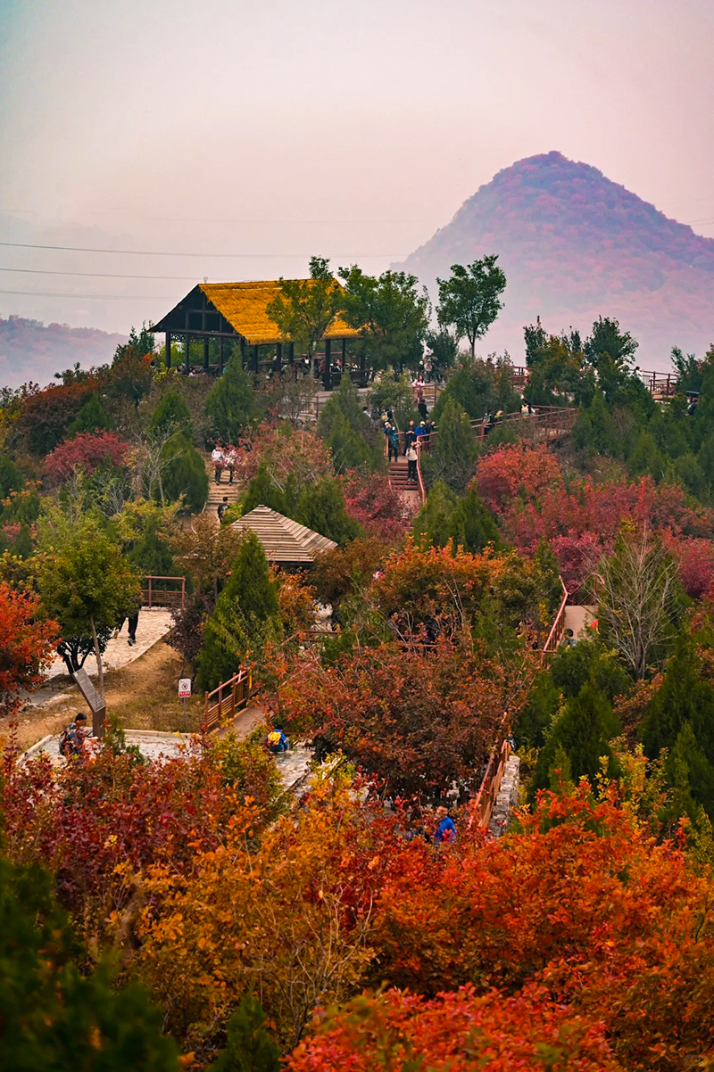作为北京著名的赏秋打卡地之一,舞彩浅山拥有数万亩各具特色的彩叶林,包括火炬、黄栌、元宝枫、银杏、白蜡等50余种树木,勾勒出赤、橙、黄、绿、紫交织的五彩风景带。