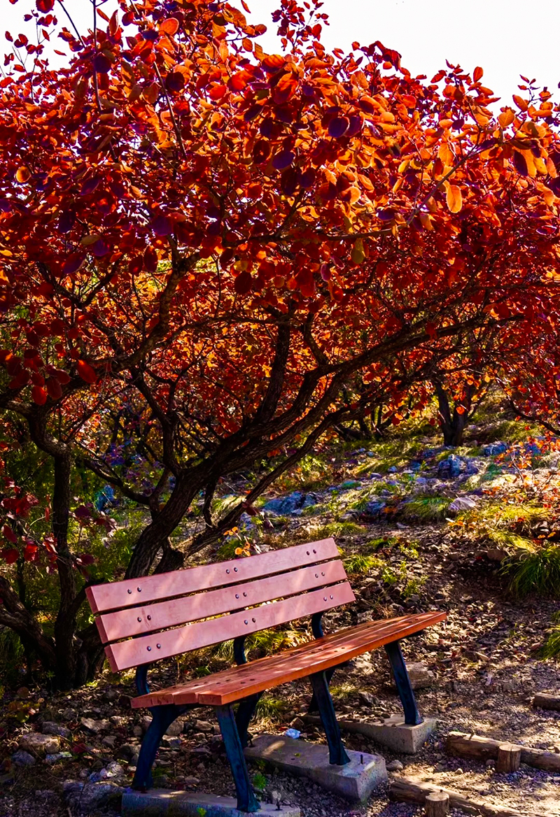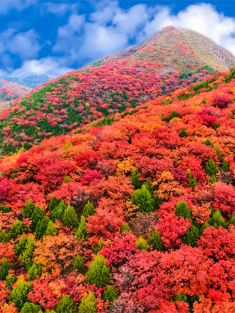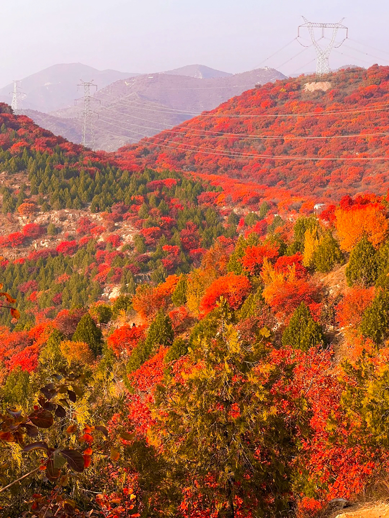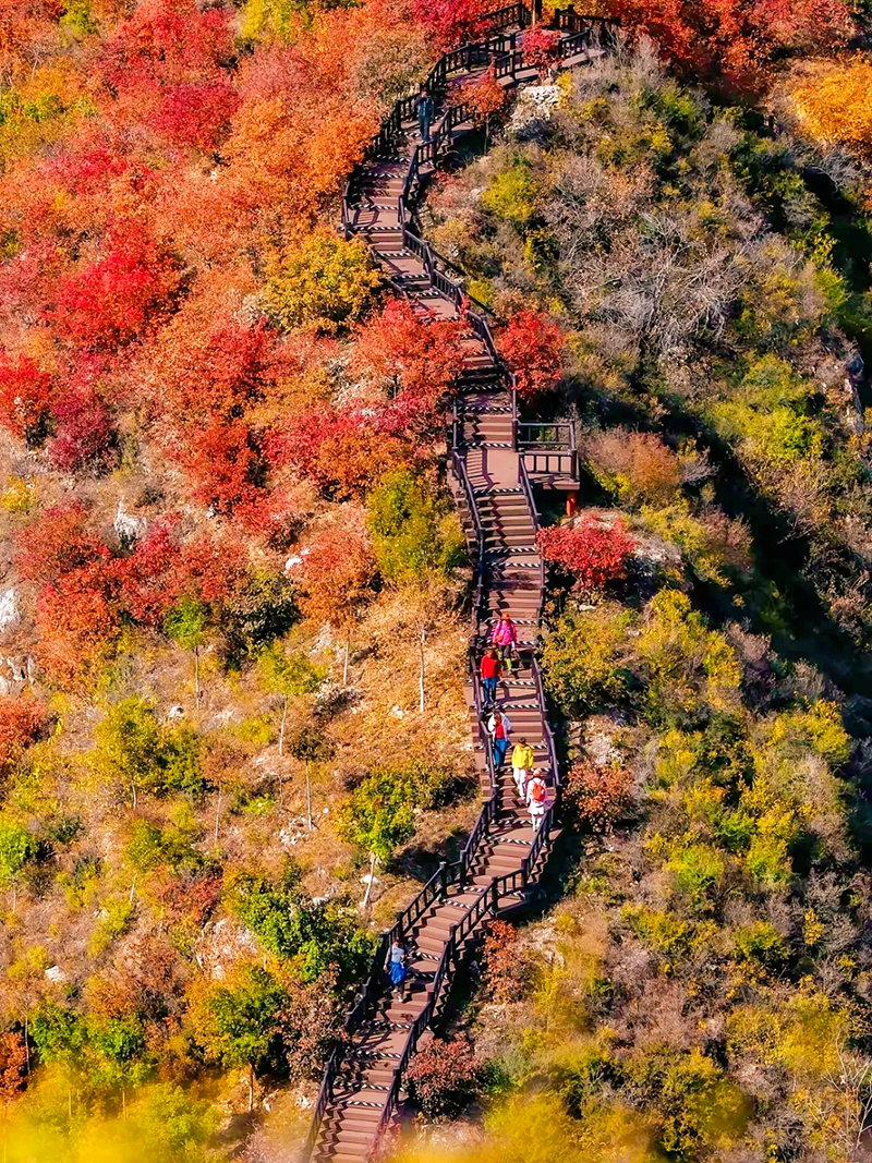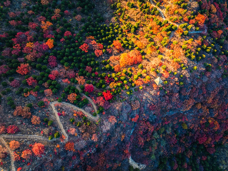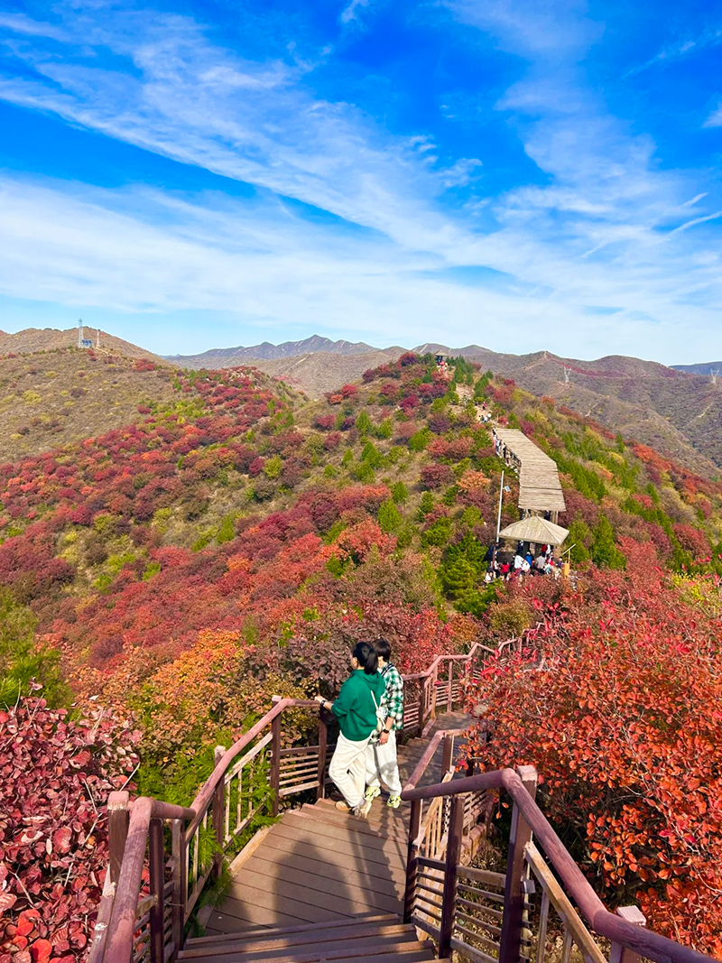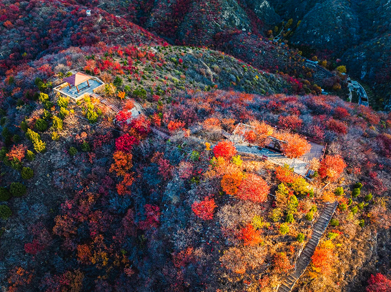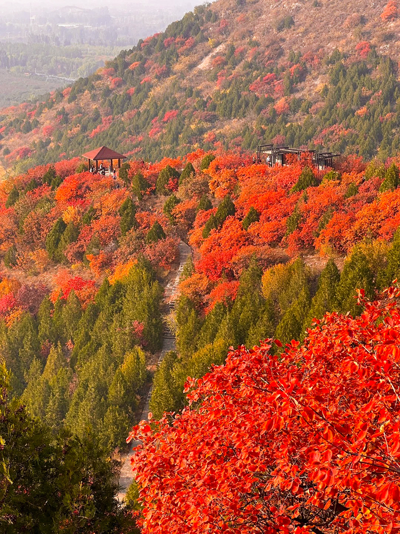 作为北京著名的赏秋打卡地之一,舞彩浅山拥有数万亩各具特色的彩叶林,包括火炬、黄栌、元宝枫、银杏、白蜡等50余种树木,勾勒出赤、橙、黄、绿、紫交织的五彩风景带。