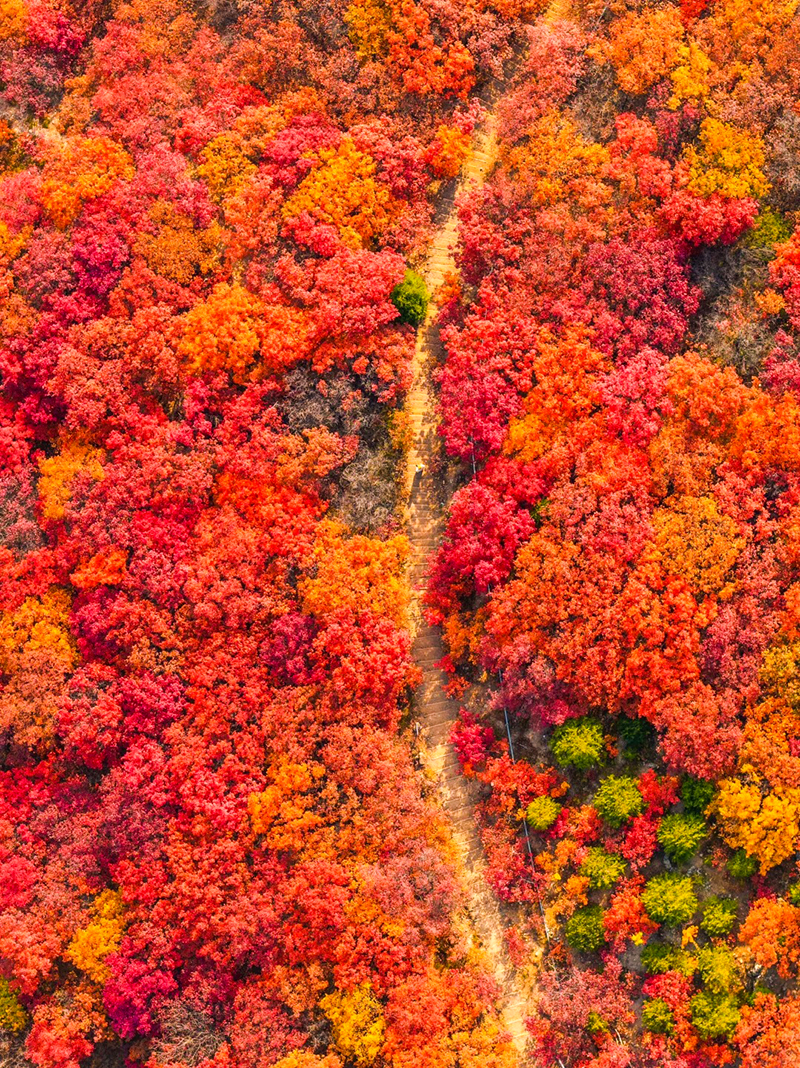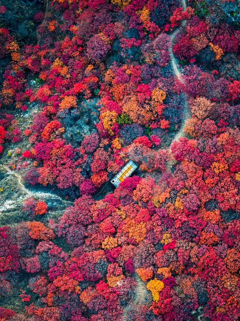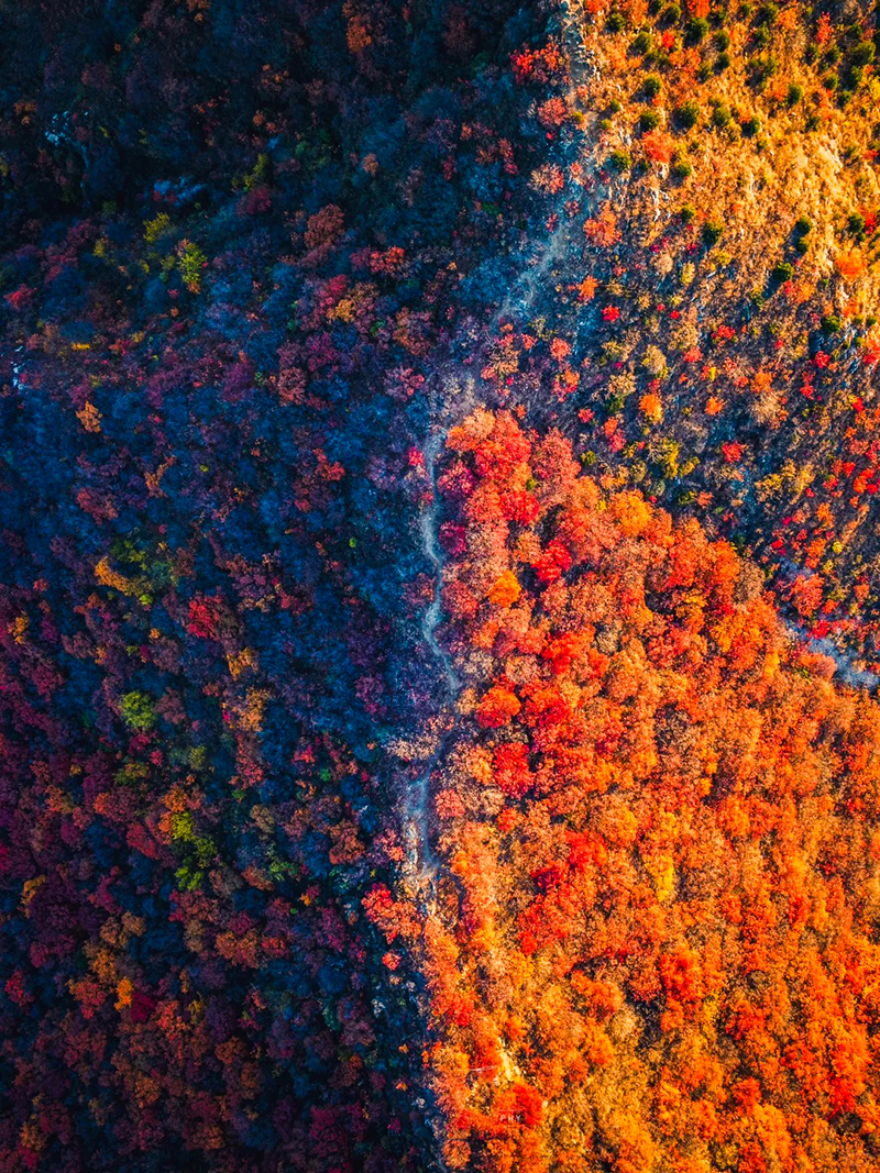 目前,红叶观赏进入了五彩斑斓的阶段,各种颜色交织渐变,一起拉开了秋的序幕。整个山谷一寸一寸染上红色、金色,渐渐把山林悉数渲染。