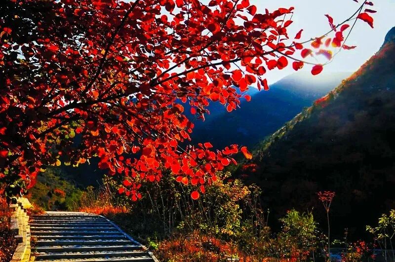 山间数万亩各具特色的彩叶林,包括火炬、黄栌、元宝枫、银杏、白蜡等树木50余种,勾勒出赤、橙、黄、绿等交织的五彩风景带。红彤彤的叶片,阳光给叶缘镶上金边,夹杂在青松翠柏之中,分外迷穿过丛林,我们能看到路边晾晒着一片玉米,秋,就是丰收的意义吧!