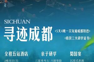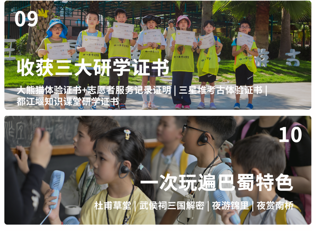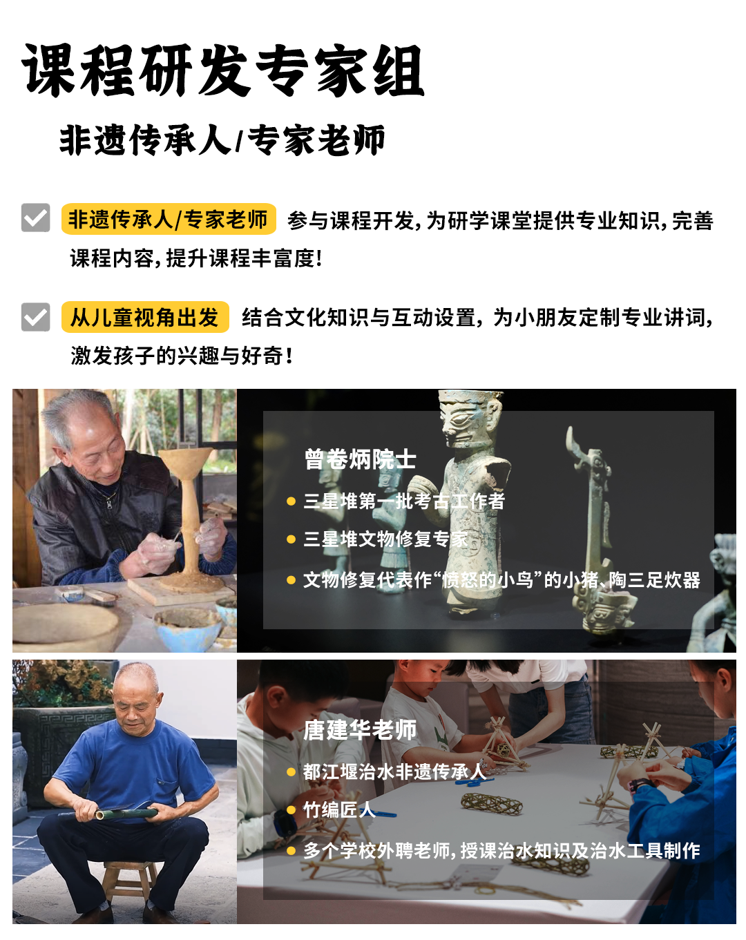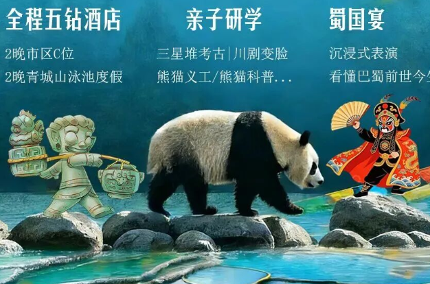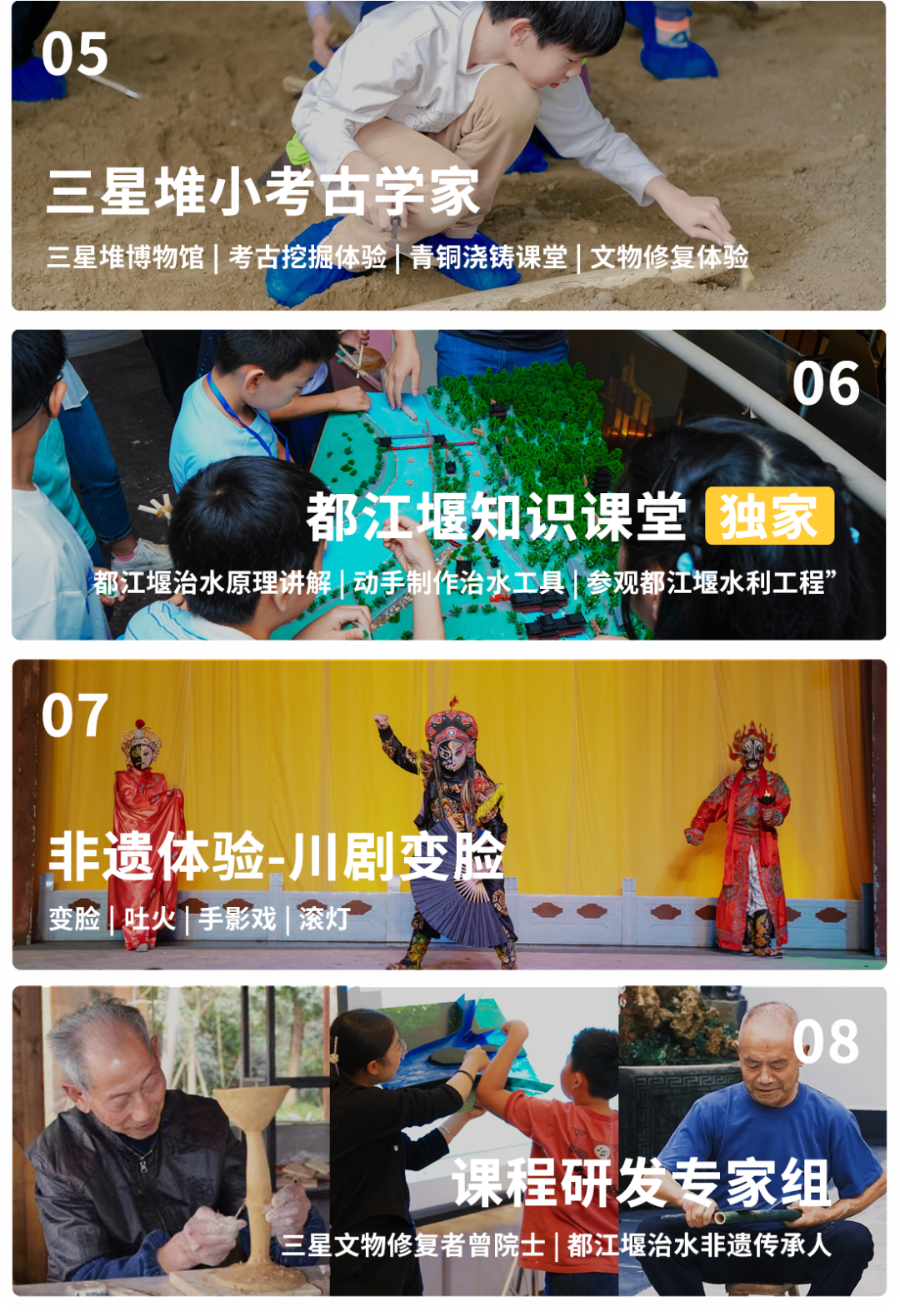 体验:蜀国宴(备选-三国宴)、川剧变脸、三星堆研学(儿童)(考古模拟体验、古法“青铜器”制作、学习文物修复)、都江堰知识课堂、大熊猫科普、大熊猫研学(儿童)(熊猫青团分析、学习古法技艺青团造纸、古法活字印刷术、熊猫营养师)