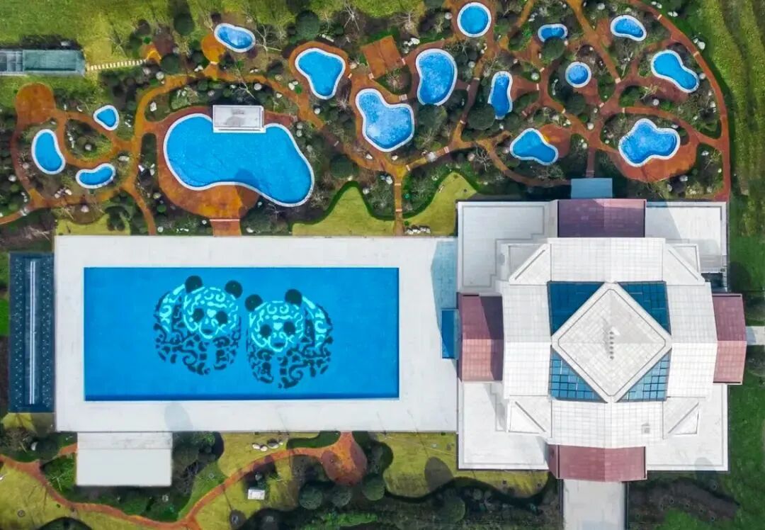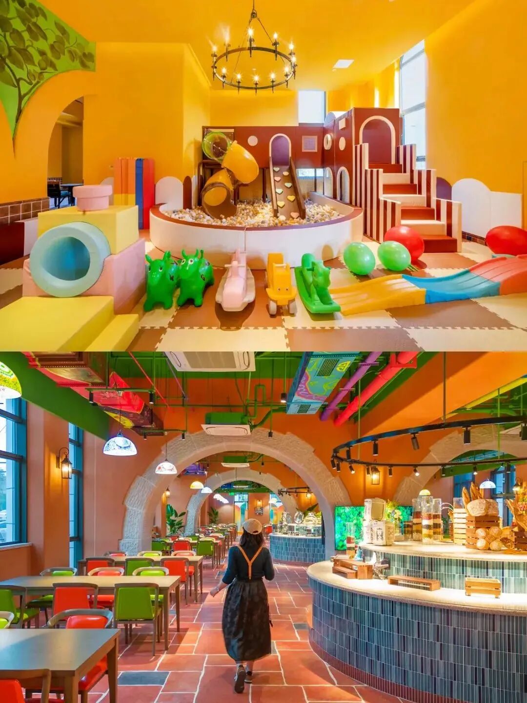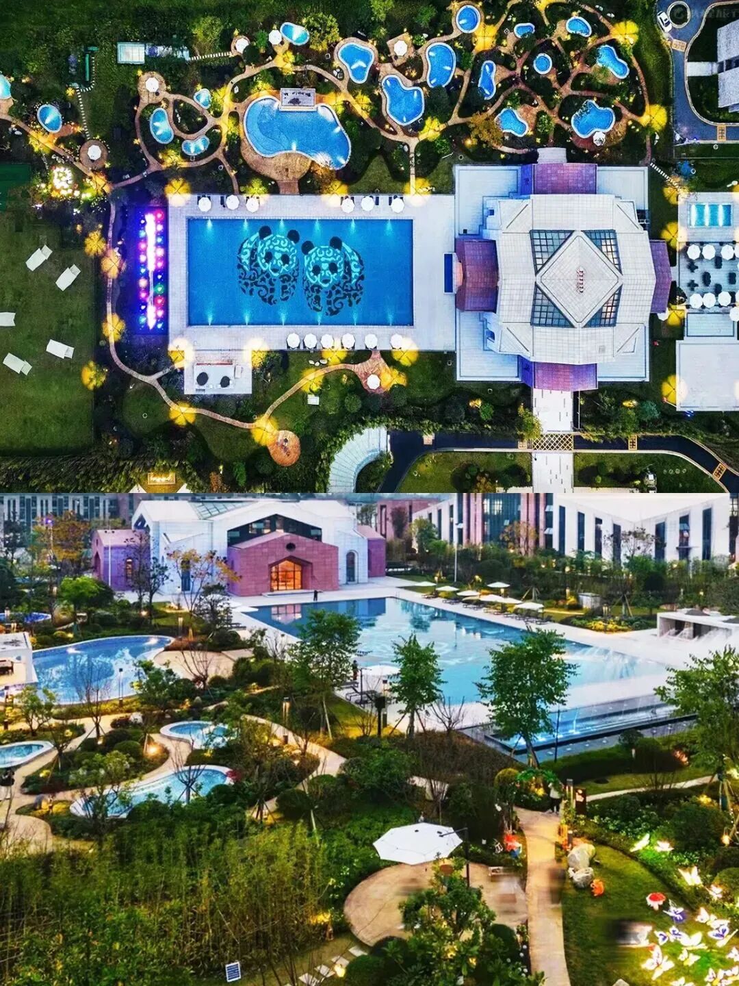 晚上,入住都江堰亲子度假酒店,酒店内温泉泡池、户外无边泳池、儿童淘气堡、萌宠乐园、休闲大厅等设施应有尽有,非常适合父母解放双手,小朋友玩乐!