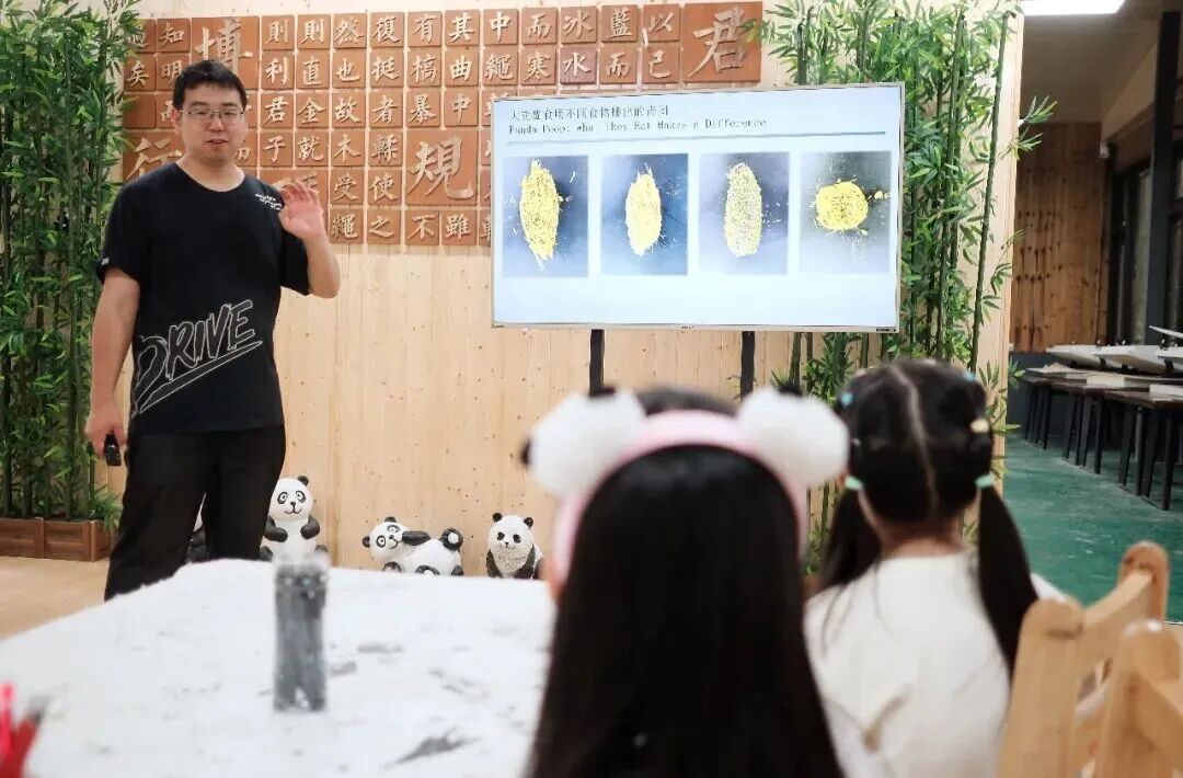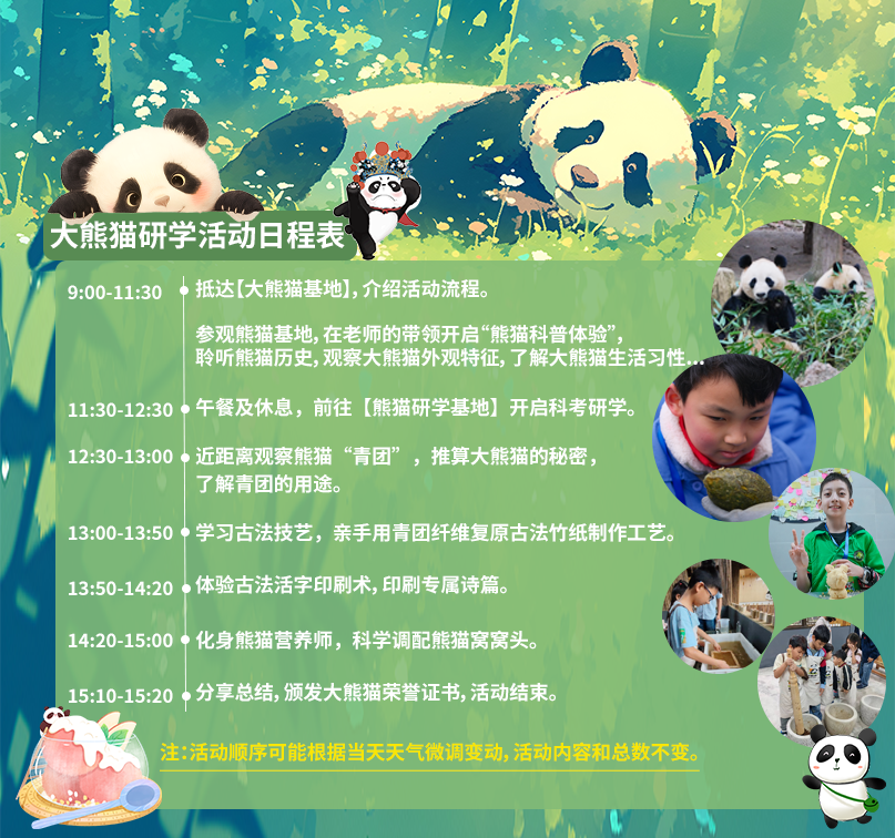 下午,前往【熊猫研学基地】进行【熊猫研学】(儿童参加,家长陪同)活动,在老师的指导下,实验操作近距离进行【熊猫青团分析】,推算大熊猫的“秘密;随后学习【古法技艺-青团造纸】,亲手用青团纤维复原古法竹纸制作工艺,并体验【古法活字印刷术】,印刷专属诗篇。