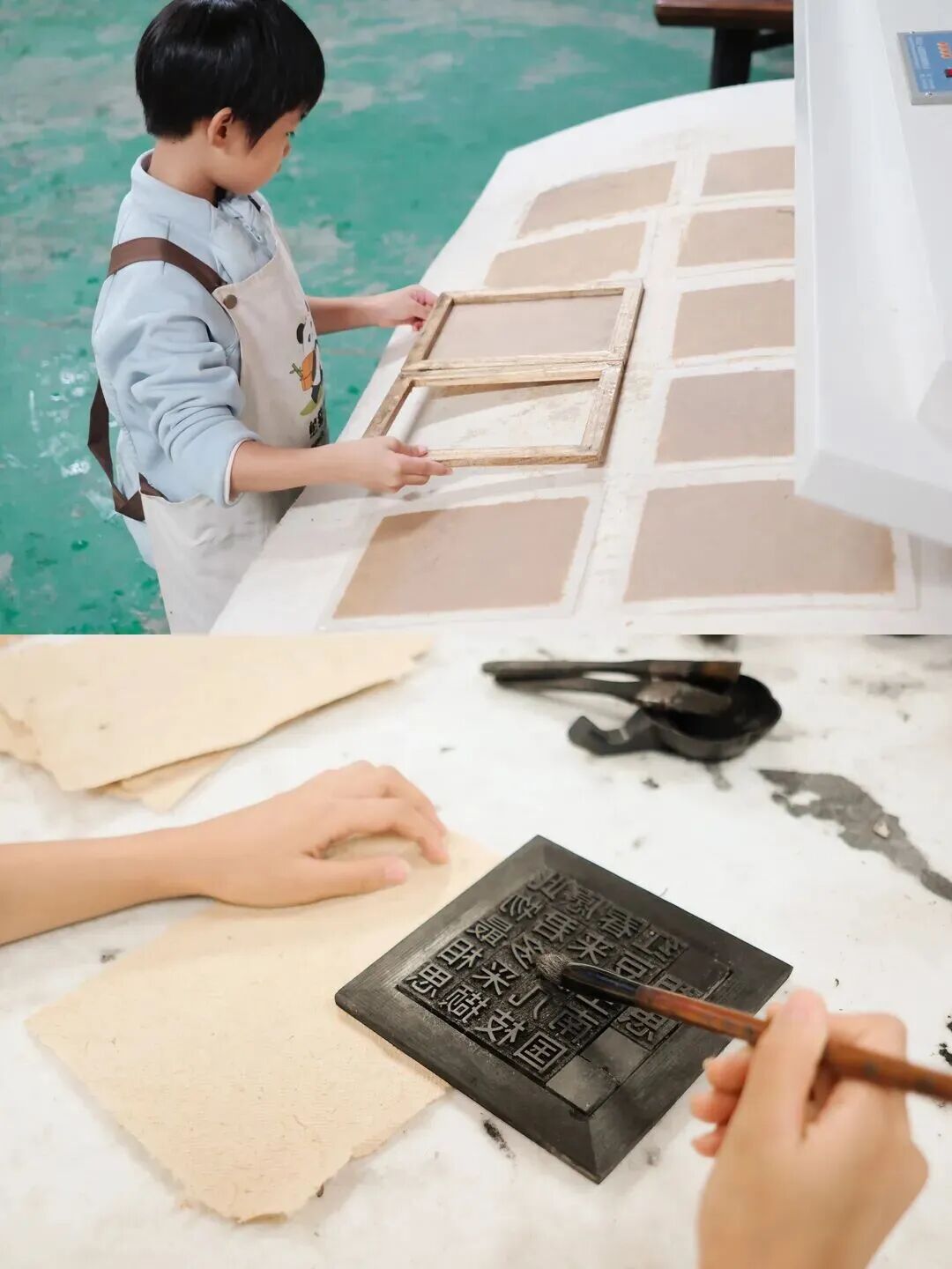 跟随老师了解活字印刷术对中国的影响,并动手在青团纸上进行古法活字印刷术体验,印刷专属的作品。