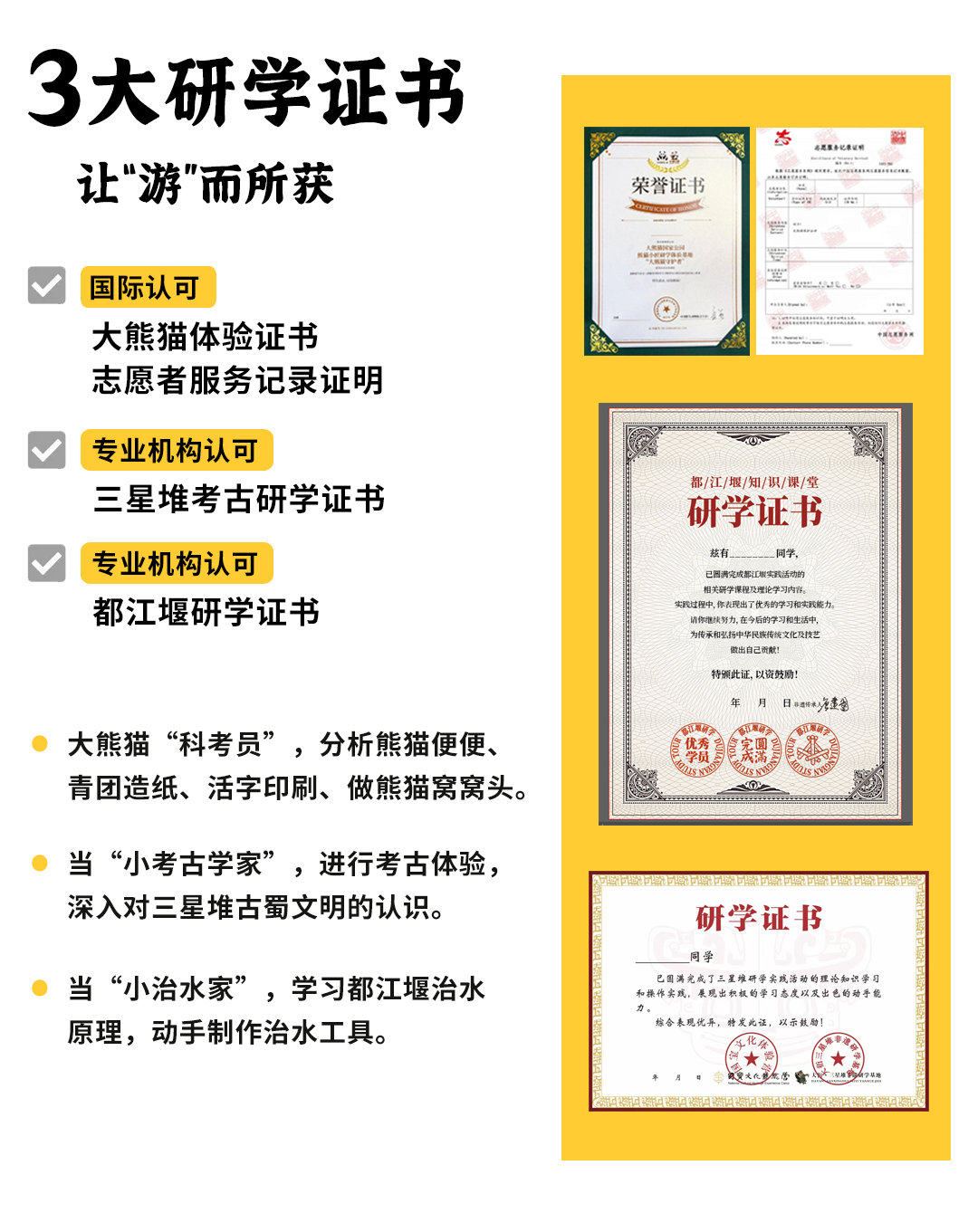考古活动体验结束后,将获得三星堆研学基地认证颁发的【三星堆考古研学证书】!