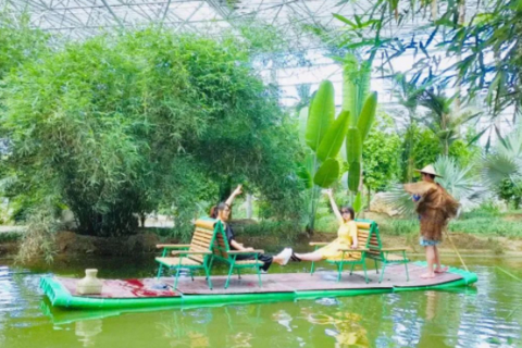 10.00|左右到达【九州伊甸园】这里是华北最大的热带雨林, 感受绚丽热带花海浪漫风情,穿越梦幻般的花色长廊。鸟语花香雨林中,上万种热带植物,花卉,小桥流水,水上碰碰车,竹筏漂流,风景美如画。北方的冬天给您送来春天的暖意(如果竹筏开放 含竹筏) +采摘应季水果(目前柚子+)