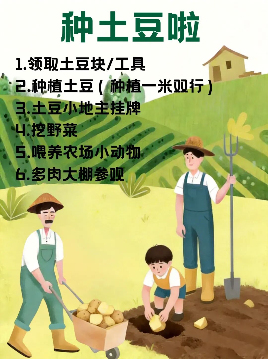 种好后,插上你的土豆小地主挂牌,写下名字和种植日期。等到100天后,土豆叶子开始变黄,就是收获的信号。再回来时,拿起小铲子,轻轻挖开泥土,一颗颗土豆像捉迷藏的小精灵,等着被你发现。