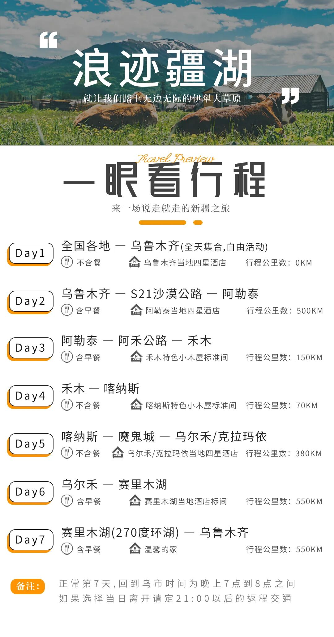4.行程中的所有出发/抵达时间、行程中游览时间、抵达景点时间等仅供参考,可能会因为淡旺季客流量、路况情况、限速等存在一定的误差,敬请谅解!