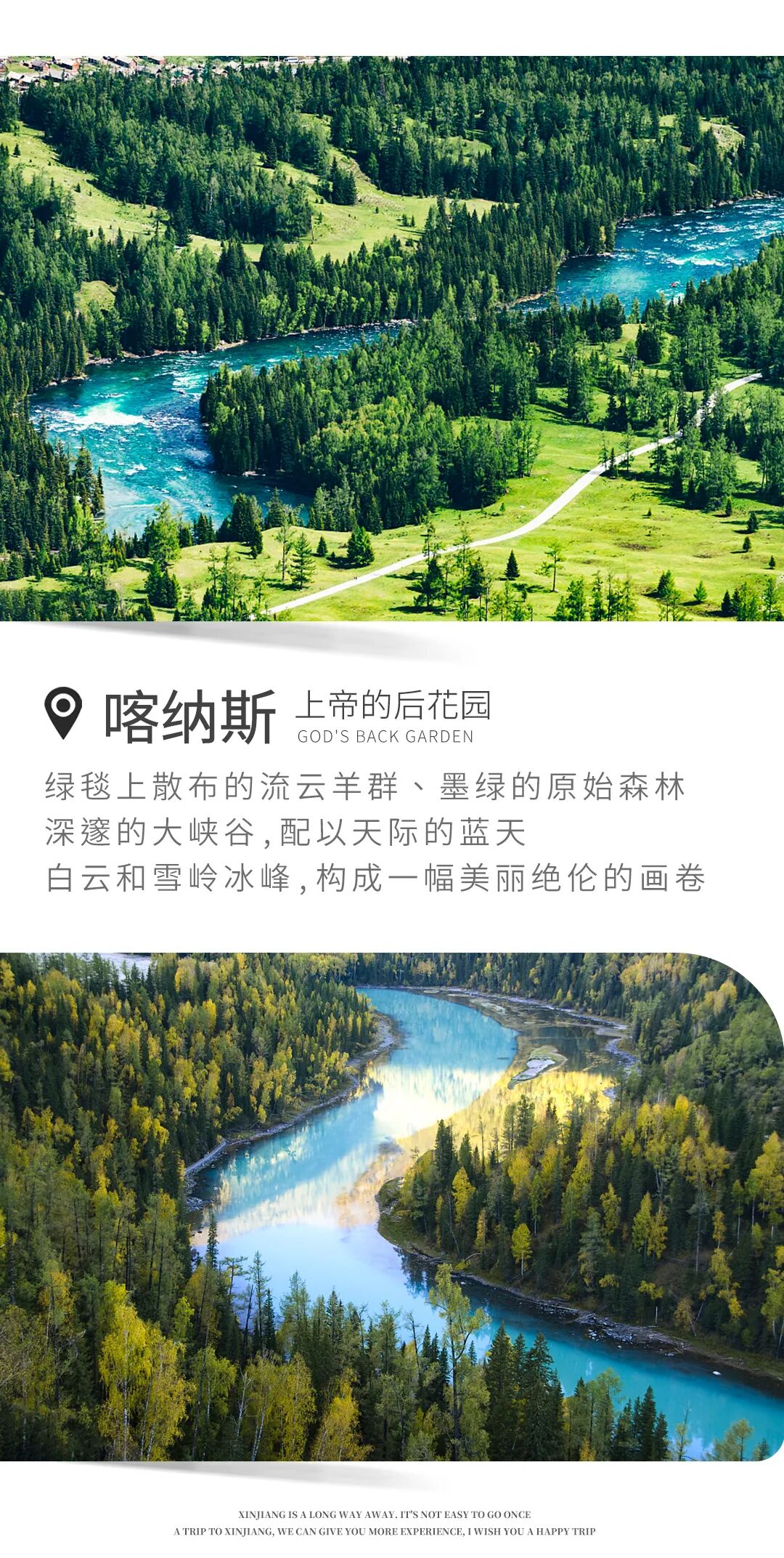 这里的区间车每到一个景点都会停车,每一个景点你都可以下车游玩,玩好了,再上停靠点等后边来的区间车, 从喀纳斯到贾登峪的路上一路经过纯净的鸭泽湖、神仙湾、圣泉、月亮湾、卧龙湾,每个点都有区间车停靠。