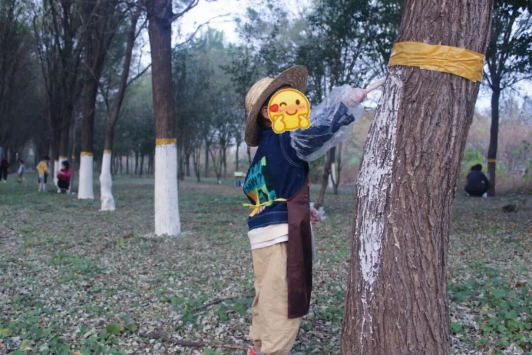 小农夫拿上刷子和小桶给小树刷白漆,冬天来了,帮助小树穿上新衣服,这样可以驱虫过冬。