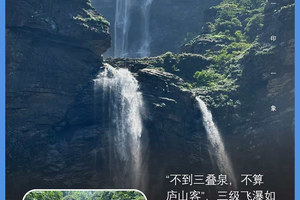 三叠泉是庐山的标志性景点之一,有 “不到三叠泉,不算庐山客” 之说。它由大月山、五老峰的涧水汇合,从大月山流出,经过五老峰背,由北崖悬口注入大盘石上,又飞泻到二级大盘石,再喷洒至三级盘石,形成三叠。每叠各具特色,上级如飘雪拖练,中级如碎玉摧冰,下级如玉龙走潭,仰看与俯视各蔚为壮观。