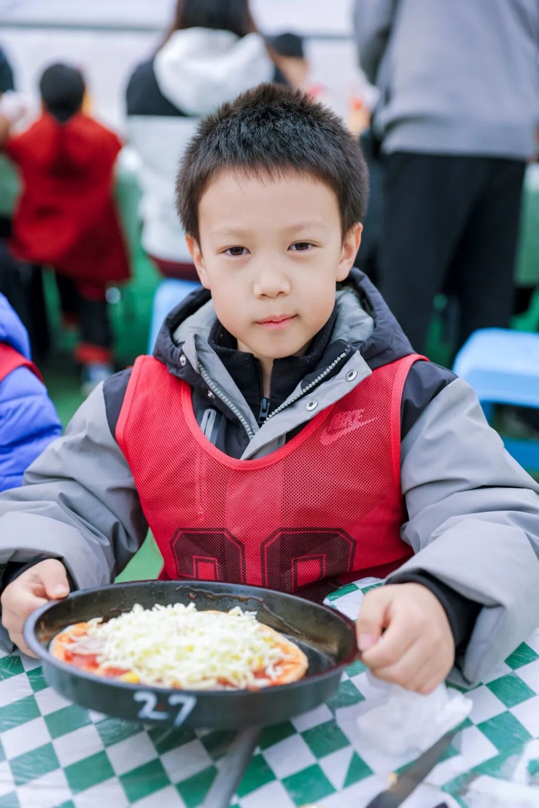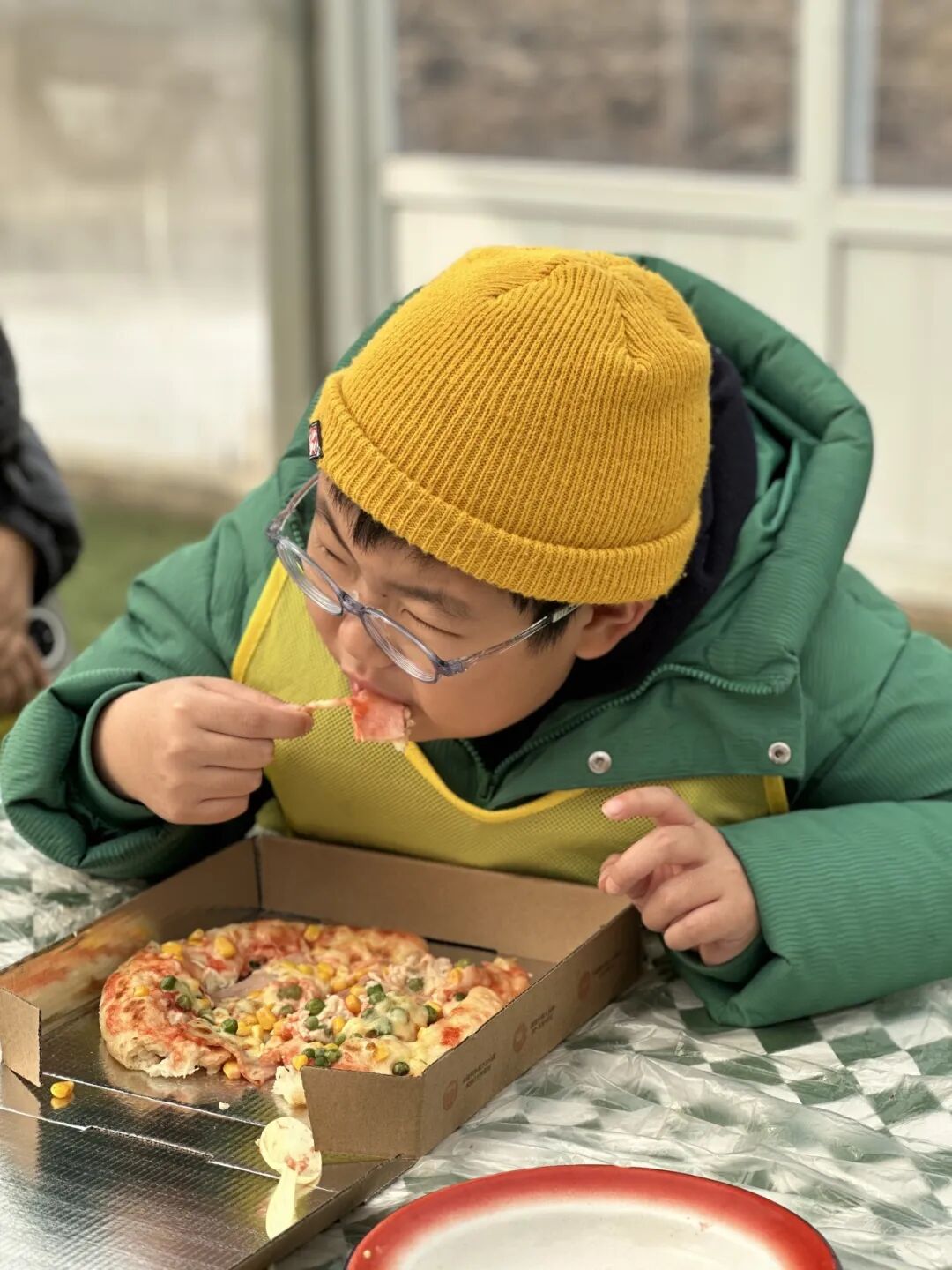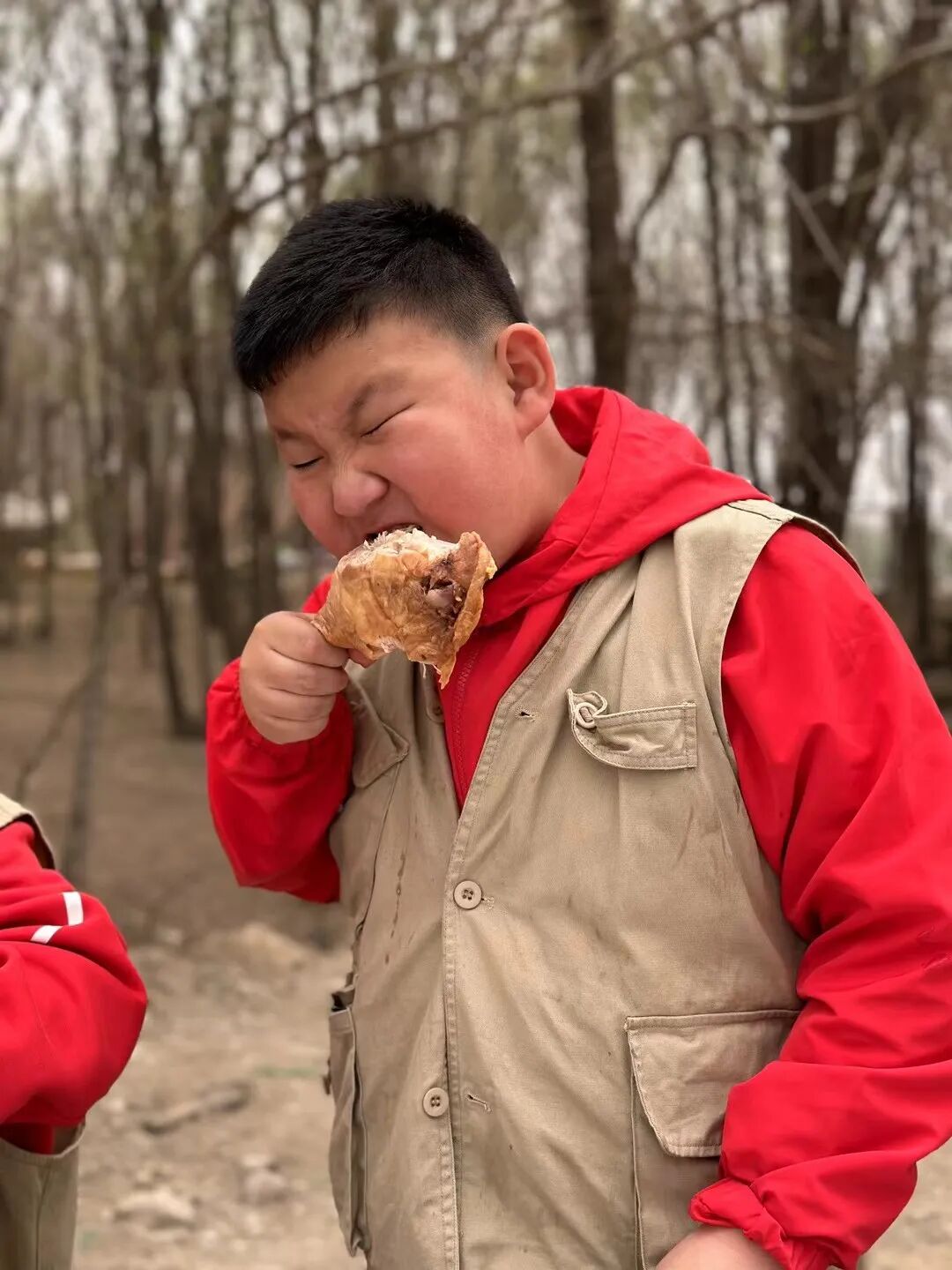 就在稻田边上吃。风吹过来,带着泥土和青草的味道。远处是刚返青的秧苗,近处是孩子端着碗跑来跑去。隔壁帐篷的小朋友端着碗跑过来:“我们家披萨分你一块!”你们家窑鸡也掰一个鸡腿送过去。