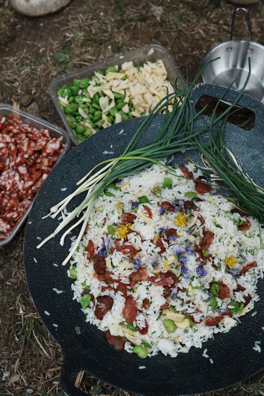 把披萨搬进帐篷里,把窑鸡撕开摆上野餐垫,盛一碗热腾腾的野火饭——这碗饭里的米,就产自脚下这片稻田。